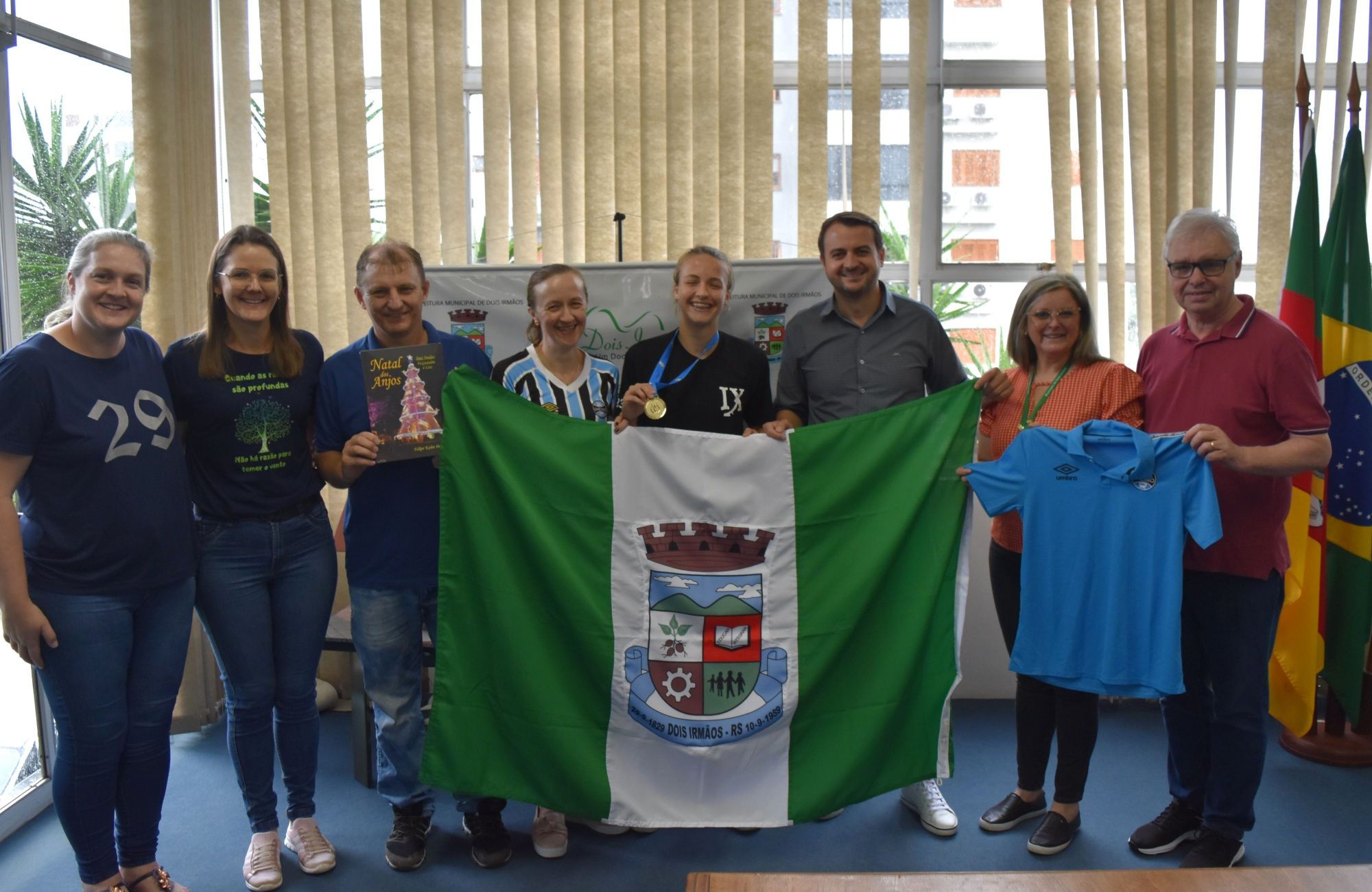 Acompanhada dos pais, Soili e Valmir Bencke, da diretora e da vice-diretora da Escola 29 de Setembro, do bairro Moinho Velho, Josi, como também é chamada, inclusive no Grêmio, foi recebida pelo prefeito de Dois Irmãos, Jerri Meneghetti, na última terça-feira (28), na sala de reuniões na prefeitura.