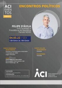 Na abertura da série Encontros Políticos 2022, a Associação Comercial, Industrial e de Serviços de Novo Hamburgo, Campo Bom e Estância Velha – ACI-NH/CB/EV recebe, nesta sexta-feira, 04, o pré-candidato à Presidência da República pelo Partido Novo, Felipe d’Ávila. Em formato híbrido, o evento ocorre das 13h15min às 14h15min.