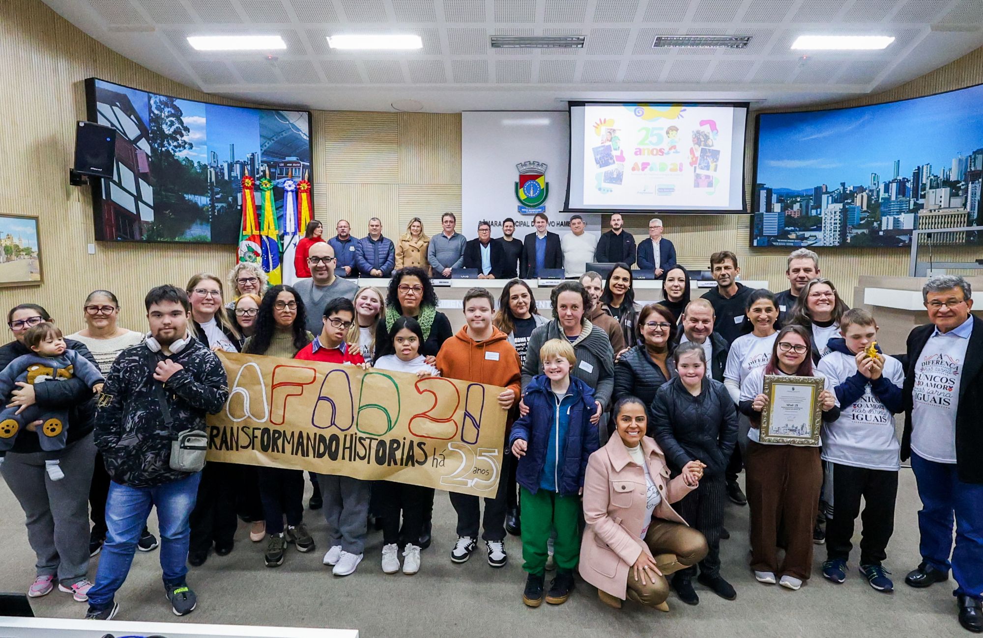 A Associação dos Familiares e Amigos do Down Vinte e Um (Afad-21) foi homenageada pela Câmara de Vereadores de Novo Hamburgo na sessão plenária desta segunda-feira (23) pelos 25 anos de trabalho voltado à inclusão e apoio a pessoas com Síndrome de Down e seus familiares. A homenagem foi proposta pela bancada do Progressistas (PP), formada pelos vereadores Cristiano Coller, Deza Guerreiro e Giovani Caju.