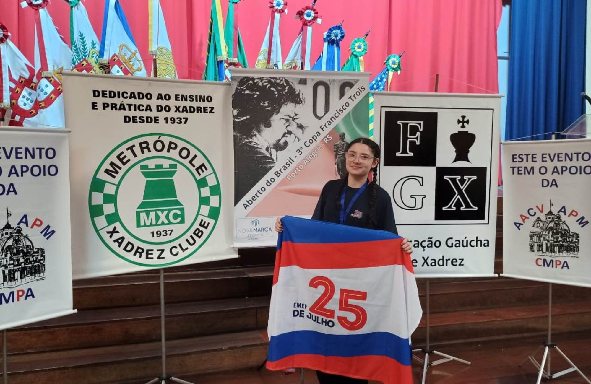 Joana Mycaella da Rosa Lauterio, aluna da EMEF 25 de Julho, participou, entre os dias 14 e 17 de novembro, do Aberto do Brasil – 3ª Copa Francisco Trois de Xadrez, realizada no Colégio Militar de Porto Alegre. Joana, com orientação técnica do professor Wilson Lucas, terminou o torneio na 4ª colocação.