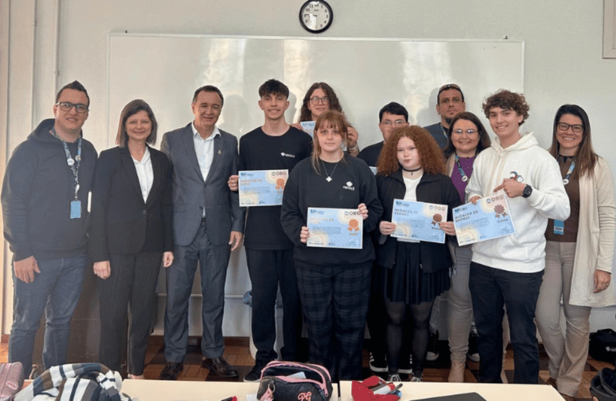 Nove estudantes da Escola de Aplicação Feevale foram premiados na manhã desta quarta-feira (10) pela participação na 10ª Olimpíada Brasileira de Geografia (OBG 2025). A entrega de medalhas de ouro e de bronze foi realizada em cerimônia realizada na instituição, em Novo Hamburgo, com a presença do reitor da Universidade Feevale, José Paulo da Rosa, e da diretora da escola, Janaína Regra.