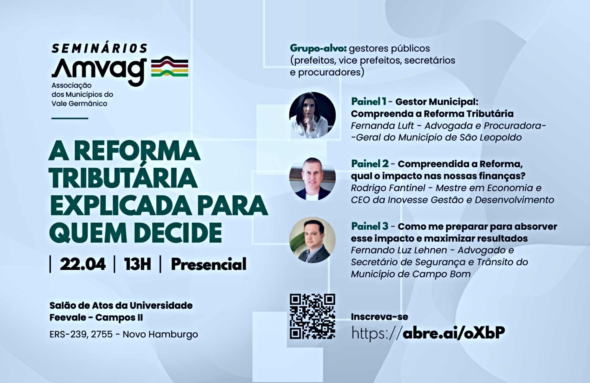 A Associação dos Municípios do Vale Germânico (Amvag) realizará o seminário “A Reforma Tributária explicada para quem decide” no próximo dia 22 de abril, em Novo Hamburgo, voltado a gestores públicos gaúchos. O evento ocorrerá no Salão de Atos da Universidade Feevale, com credenciamento a partir das 13h e início dos painéis às 13h30min. A proposta é apresentar, de forma prática, os impactos das mudanças no sistema tributário brasileiro sobre os municípios, abordando questões relacionadas à arrecadação, gestão fiscal e tomada de decisão nas administrações locais.