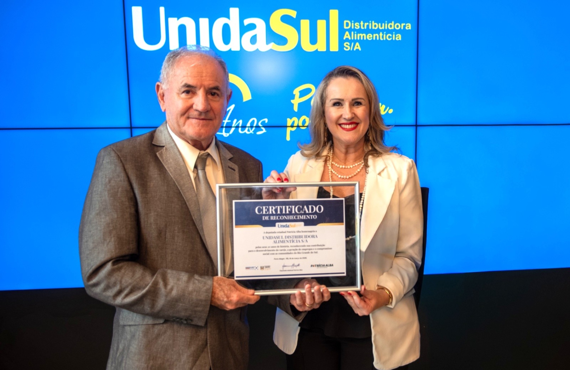 A Assembleia Legislativa do Estado do Rio Grande do Sul realizou, na tarde da quarta-feira, 18 de março de 2026, no Salão Nobre Júlio de Castilhos, um ato solene em homenagem aos 20 anos de trajetória do Grupo UnidaSul. Proposta pela deputada estadual Patrícia Alba, a iniciativa reconheceu a contribuição da companhia para o desenvolvimento econômico e social do Estado ao longo de duas décadas. “Este reconhecimento faz jus aos investimentos que uma empresa genuinamente gaúcha fez e continua a realizar, ao longo de sua história, para o desenvolvimento do Rio Grande do Sul, tanto como marca empregadora quanto pelos relevantes projetos sociais que apoia”, destacou Patrícia Alba.