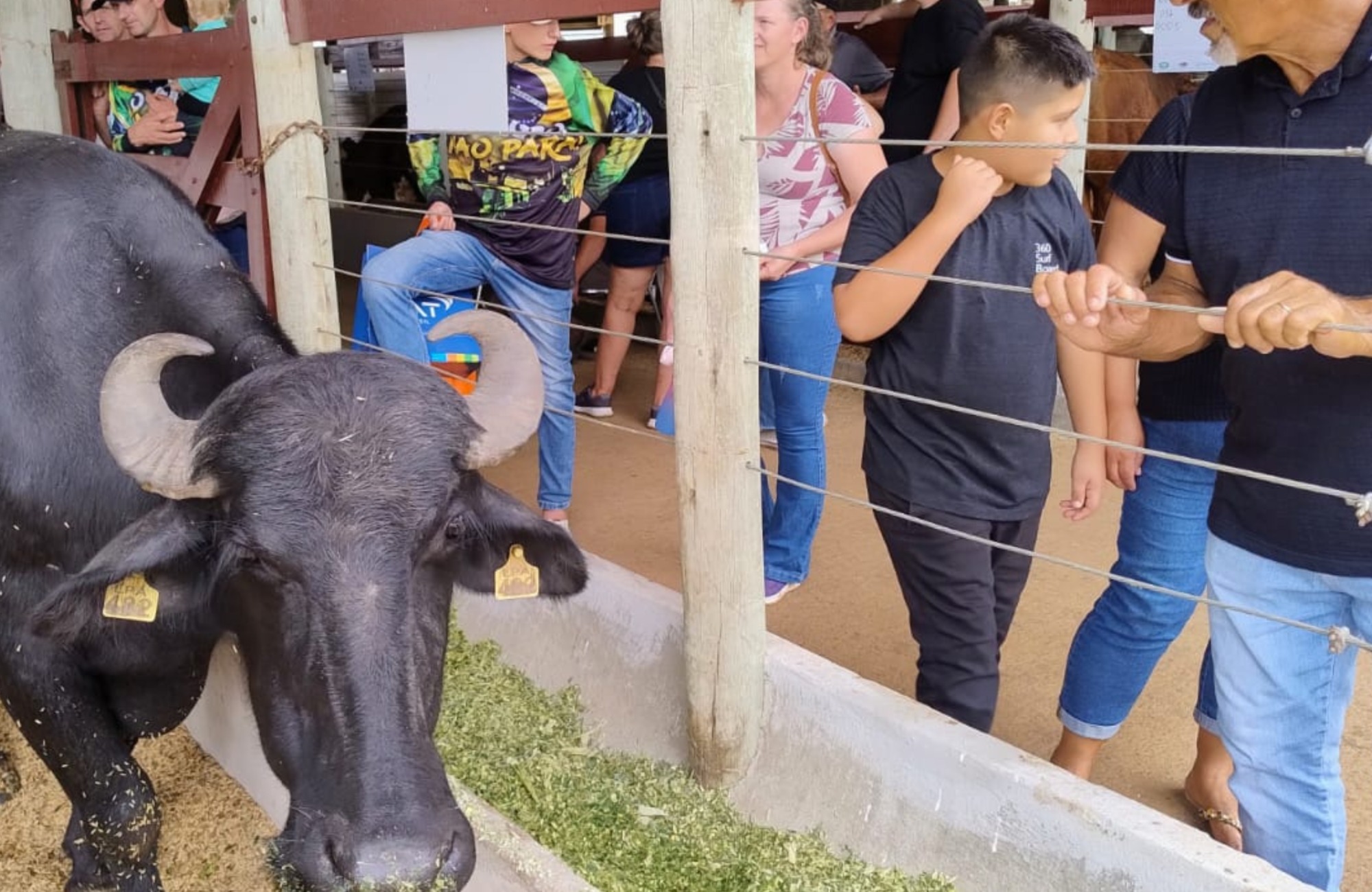 A convite da organização, a Fazenda Coxilha Grande, de Butiá (RS), participa pela segunda vez do evento, após presença em 2024. Neste ano, o espaço dedicado à bubalinocultura conta com quatro exemplares da raça Murrah, sendo duas vacas com cria ao pé, uma fêmea com sete dias e outra com três meses.