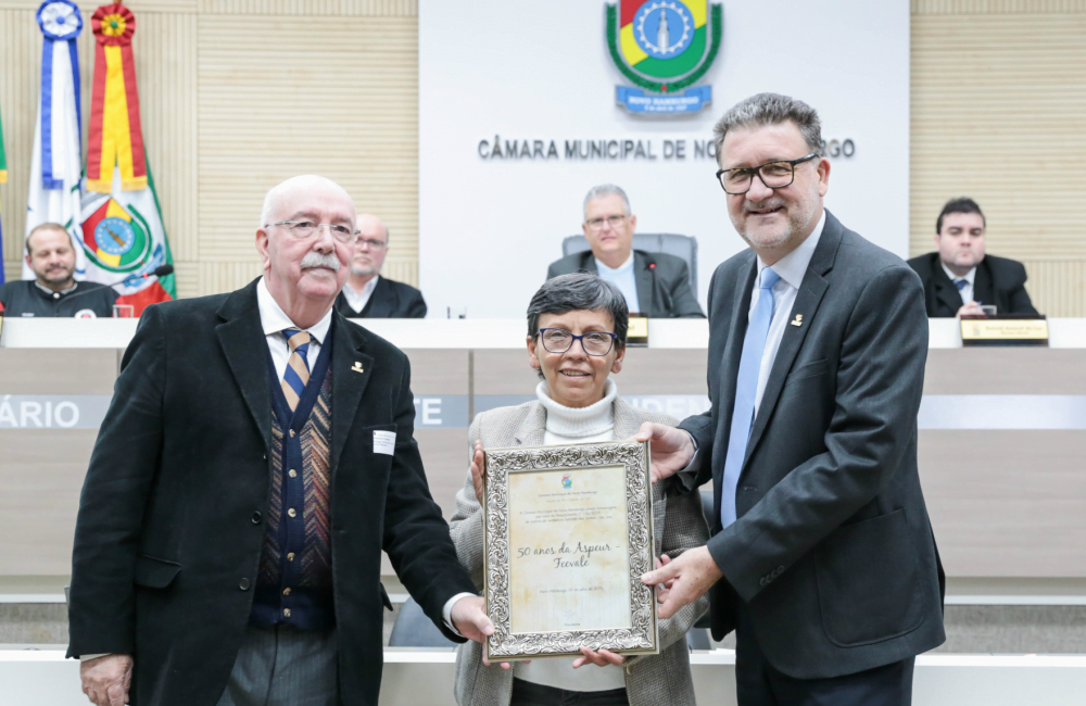 Após a fala dos parlamentares, a proponente da comemoração, a vereadora Tita entregou um quadro que homenageia os 50 anos da Aspeur/Feevale ao reitor da Feevale, o professor Dr. Cleber Prodanov, e ao presidente do Conselho de Administração da Aspeur, Roberto Cardoso.