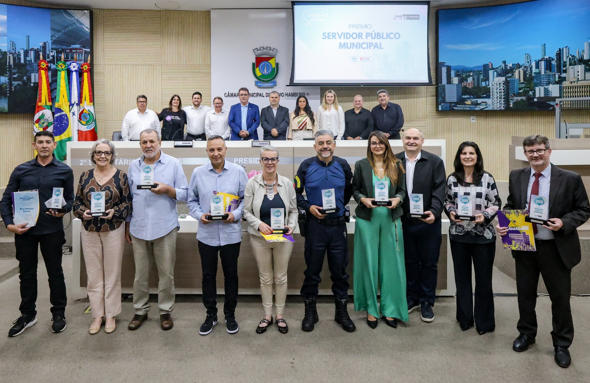 A Câmara de Vereadores de Novo Hamburgo realizou a entrega da 2ª edição do Prêmio Servidor Público na noite desta quinta-feira (6), com o reconhecimento de 12 profissionais ativos e aposentados por suas trajetórias de dedicação ao serviço da comunidade. A cerimônia, realizada no Plenário Luiz Oswaldo Bender, reuniu autoridades, familiares, colegas e público em geral, com transmissão pelos canais oficiais da TV Câmara NH. A premiação, regulamentada pelo Decreto Legislativo nº 1/2024, dialoga com o Dia do Servidor Público, celebrado em 28 de outubro, e busca valorizar o papel fundamental do funcionalismo na construção da vida coletiva.