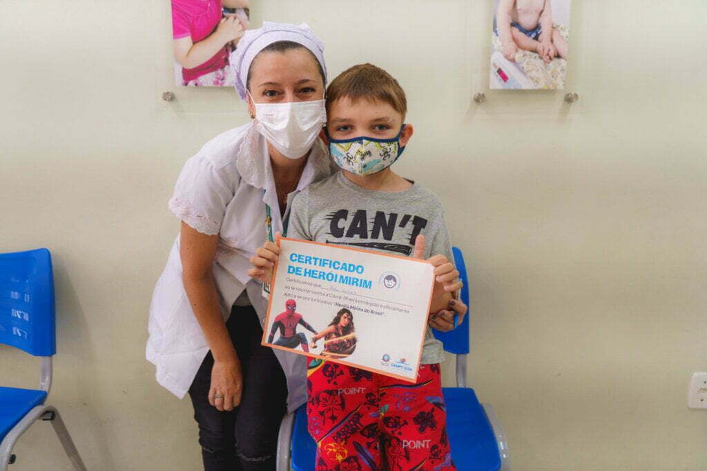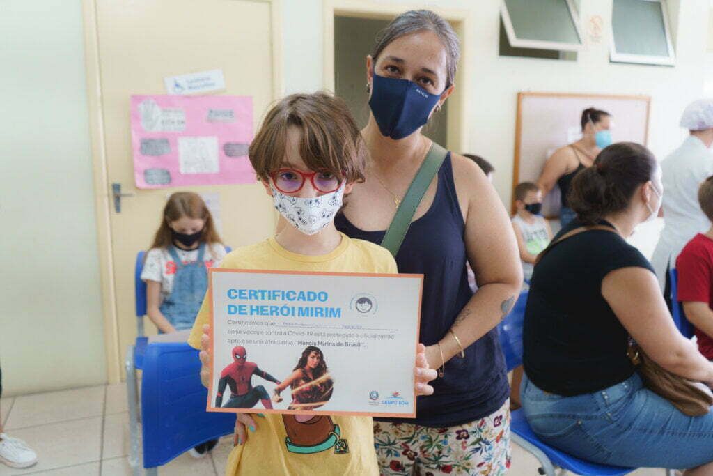 As crianças que se vacinara contra a Covid-19, em Campo Bom, tiveram uma surpresa: todas receberam um “Certificado de Herói Mirim”. A vacinação infantil teve início da manhã na quarta-feira, dia 19, para o grupo de 5 a 11 anos, com comorbidades; e segue ao longo da semana no Centro Materno Infantil (CMI).