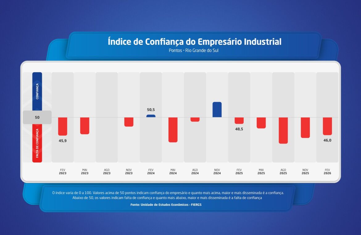 O Índice de Confiança do Empresário Industrial (Icei-RS), divulgado na terça-feira (24) pelo Sistema Fiergs, revela uma pequena redução, em fevereiro, na comparação com janeiro: de 46,3 para 46 pontos. O afastamento da linha dos 50 pontos sinaliza para um aumento na falta de confiança. “A pesquisa mostra que são 15 meses consecutivos de avaliação negativa entre os empresários. A indústria permanece com cenário desfavorável tanto na situação atual quanto nas expectativas futuras”, diz o presidente do Sistema FIERGS, Claudio Bier.