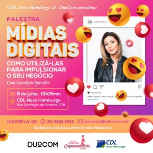 A Câmara de Dirigentes Lojistas de Novo Hamburgo – CDL-NH promove em parceria com a agência de marketing digital, DuoCom, palestra sobre mídias digitais. O evento acontece em 6 de julho, a partir das 19h15, na sede da CDL-NH, Rua Domingos de Almeida, 708, Centro.
