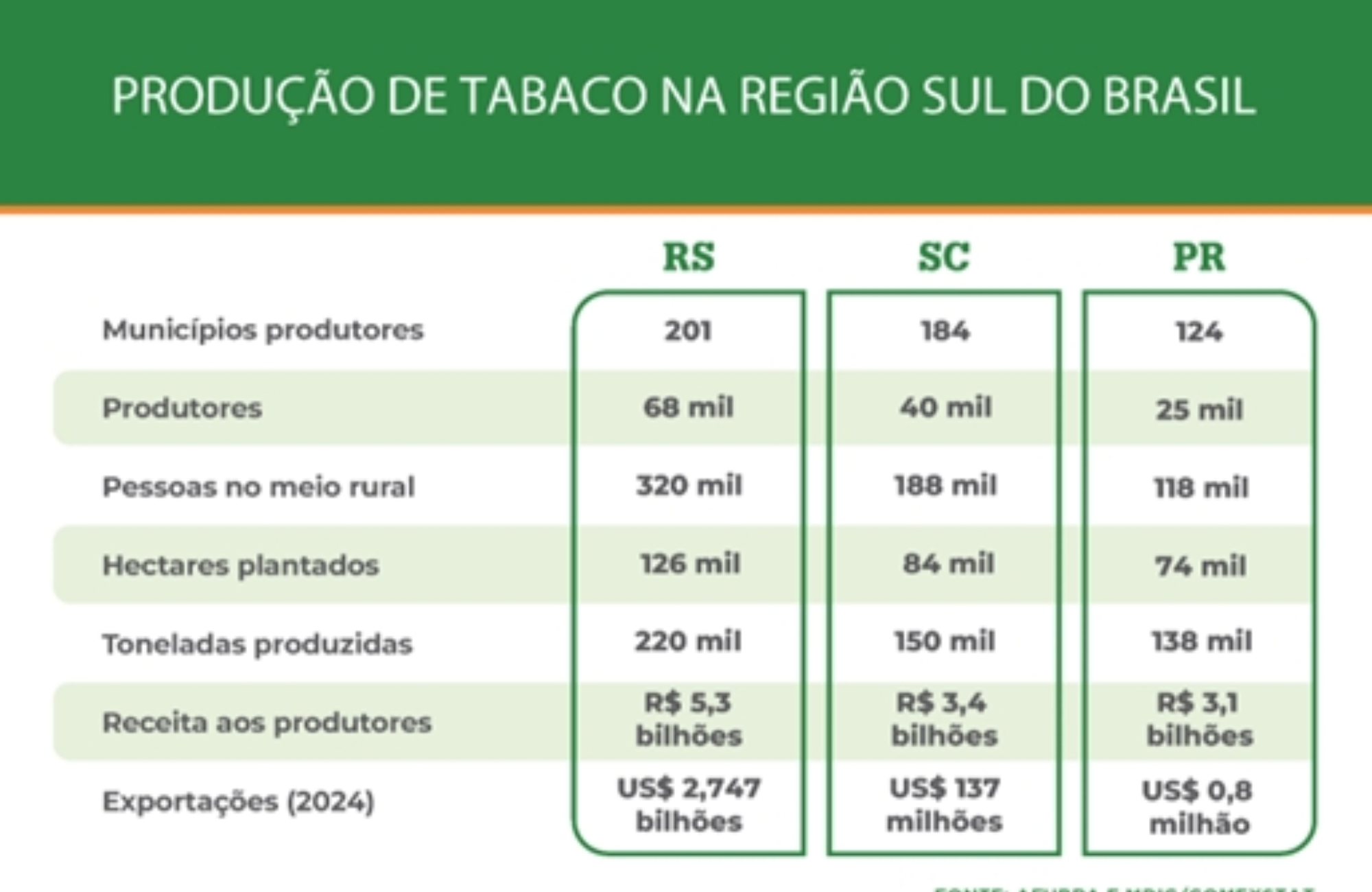 A cultura do tabaco na Região Sul do País é mola propulsora da economia de 509 municípios. São 626 mil pessoas envolvidas com a atividade que gerou na última safra 11,8 bilhões de receita aos produtores integrados. O tabaco produzido tem como destino principal a exportação: em 2024, o produto gerou US$ 2,89 bilhões em divisas e R$ 16,8 bilhões em impostos.