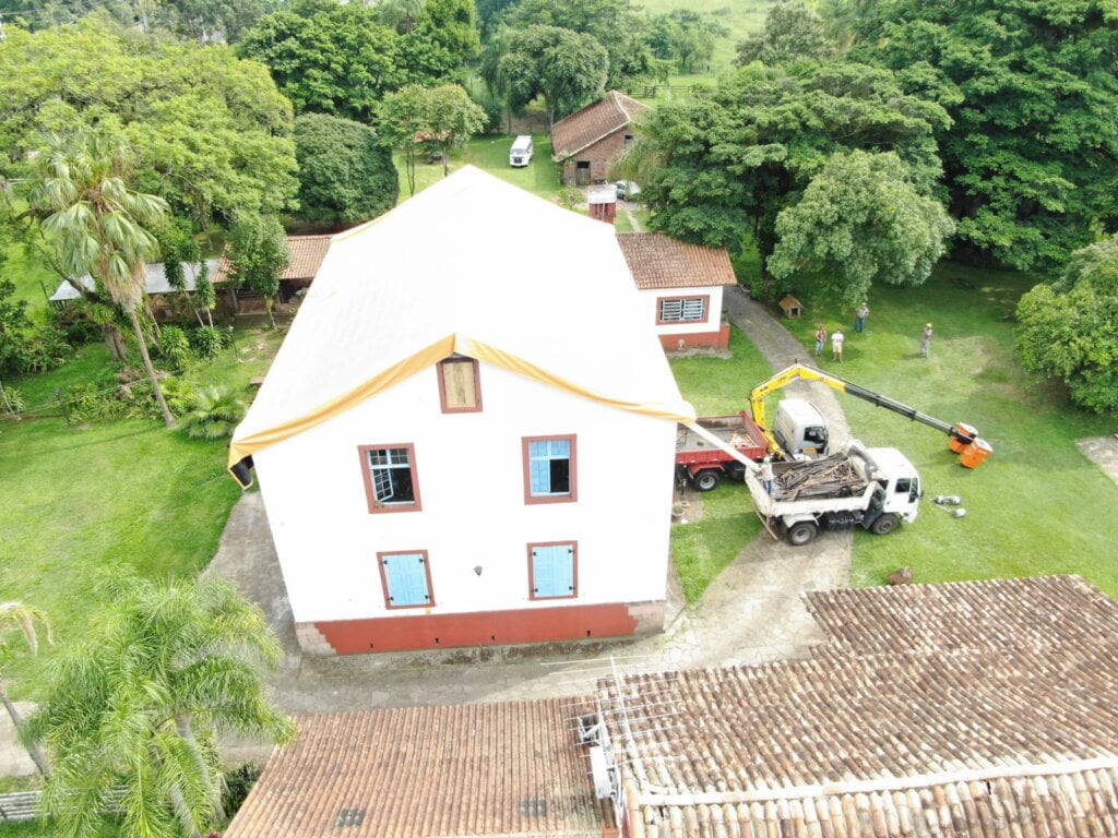 A colocação da cobertura provisória de parte do telhado do Casarão Friedrich, localizado na Estrada Germano Friedrich, nº 55, no bairro Guarani, em Novo Hamburgo, foi concluída no sábado (5), pela empresa contratada pela Prefeitura. Os trabalhos tiveram acompanhamento da Secretaria Municipal de Obras Públicas, Serviços Urbanos e Viários (Semopsu) e incluíram limpeza do local, escoramento da estrutura, separação das telhas originais e a cobertura provisória, em lona, que mede aproximadamente 220 metros quadrados.