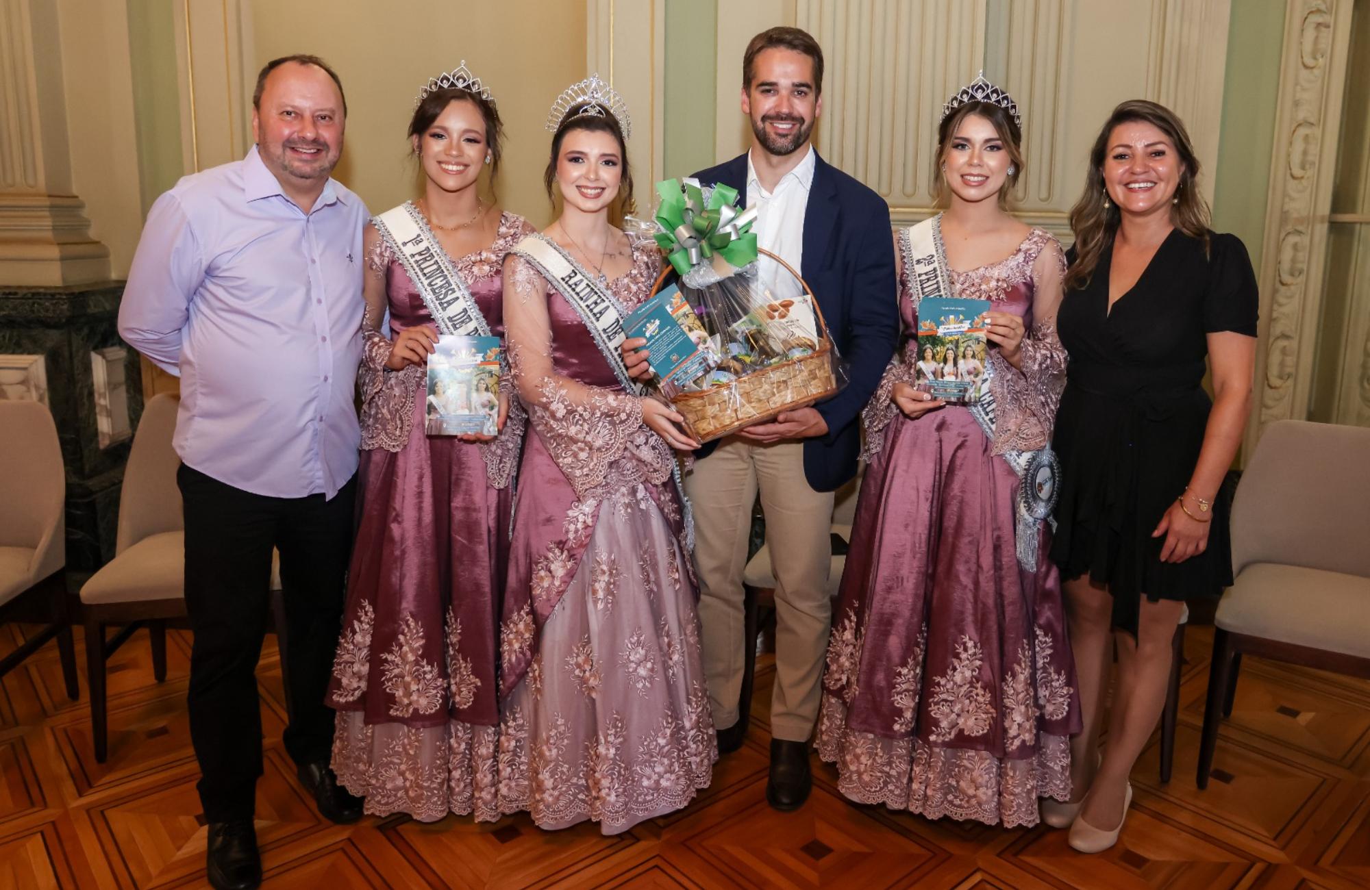 Muita cordialidade marcou a recepção do governador Eduardo Leite à comitiva cafeense no Palácio Piratini. Na última quarta-feira (08), o prefeito Luciano Klein, a secretária Ivete Galhardo (Indústria, Comércio e Turismo) e as soberanas Ketwin Jahn, Tainá Caroline Galhardo e Laura Vitória Mendes estiveram em Porto Alegre, quando convidaram o Governador do Estado para o ato de inauguração da pavimentação da estrada Vicente Prieto e a Abertura Oficial da 31ª Kaffeeschneis’Fest, agendados para o próximo dia 18 de março.