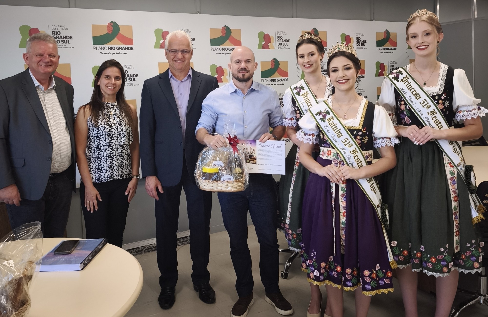 Uma comitiva de Nova Petrópolis esteve em Porto Alegre nesta segunda-feira (26) para entregar convites oficiais da 51ª Festa do Figo a autoridades estaduais, em agendas realizadas no Centro Administrativo do estado e na Assembleia Legislativa (ALRS). Participaram das visitas o prefeito Daniel Carlos Michaelsen (Republicanos), a secretária municipal de Agricultura e Meio Ambiente, Denise Maltoni Bino, o presidente da Associação Cultural e Esportiva Linha Brasil, Celso Seefeld, e as soberanas do evento, a rainha Sophia Zang e as princesas Emanuelli Thomassoni Bino e Manuela Wedig.