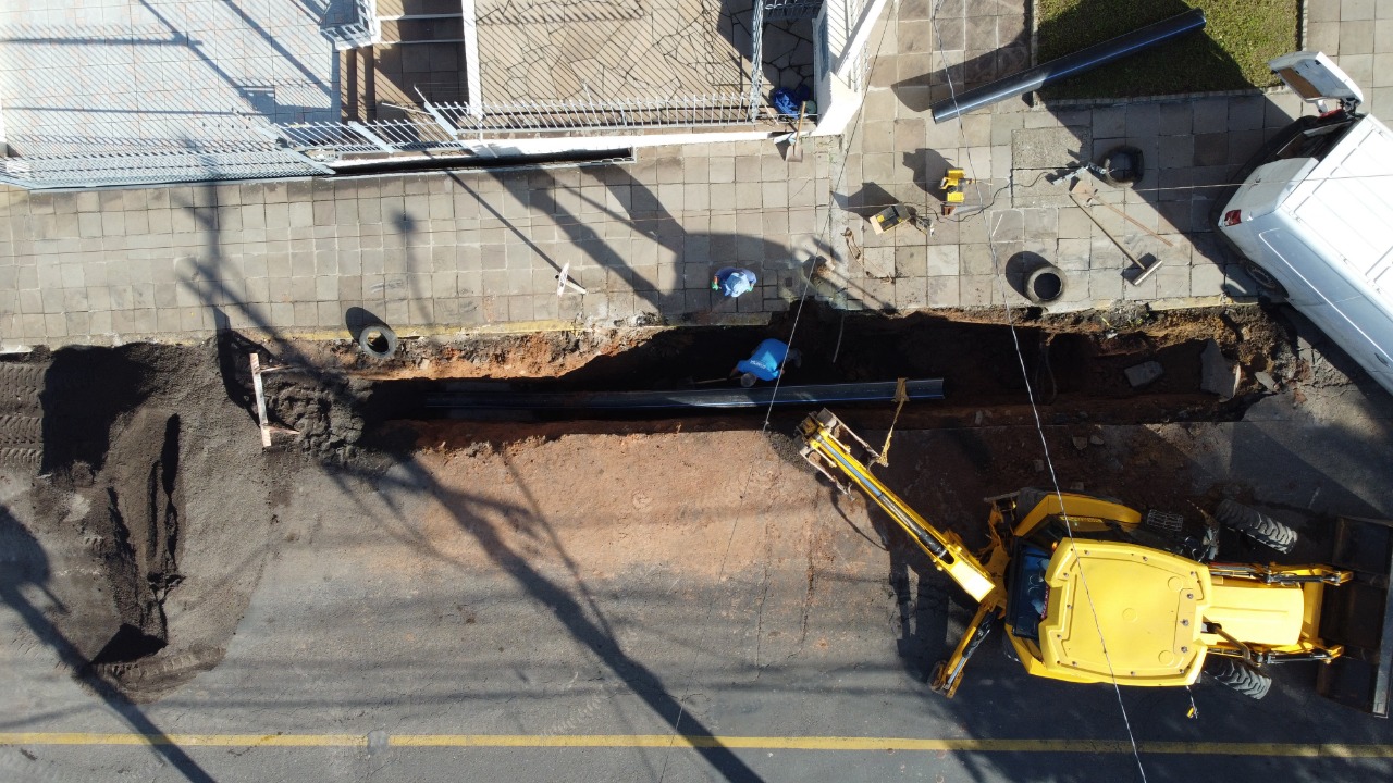 Nas últimas semanas, as equipes de obras da Comusa – Serviços de Água e Esgoto de Novo Hamburgo têm trabalhado na instalação de novas redes no Centro da cidade, na Rua Magalhães Calvet. A obra é de instalações remanescentes da substituição de redes no bairro, interrompidas em 2020, durante a pandemia.