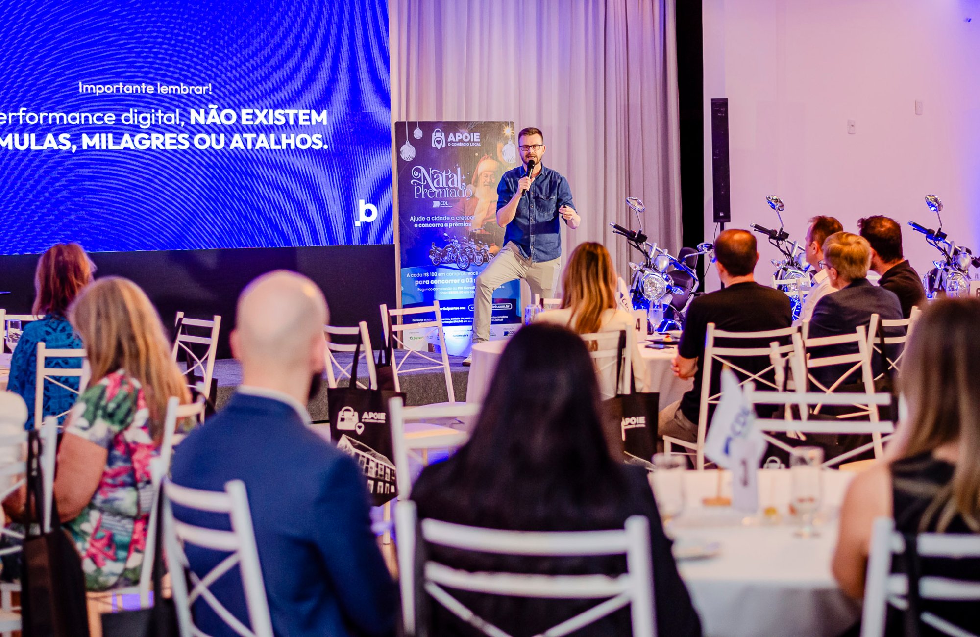 O presidente da CDL-NH, Leonardo Lessa, abriu a programação ressaltando a relevância do tema no momento em que a campanha de Natal ganha força. “O Natal tem essa força de movimentar a economia local, e isso depende de como nos comunicamos e alcançamos nossos clientes. Por isso, o tema desta noite conversa tão bem com o que estamos vivendo”, afirmou Lessa, que ainda apresentou ao público o vídeo institucional da campanha.