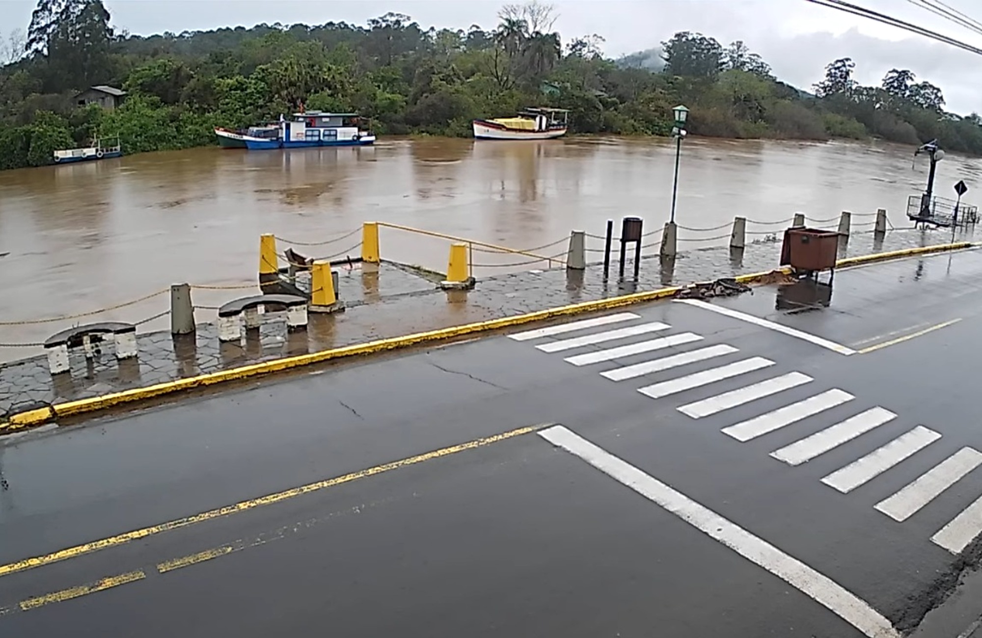 As chuvas do fim de semana e da madrugada desta segunda-feira (22) elevaram o nível do Rio Caí para 5,28 metros às 8h30min, na régua do sistema Sace instalada no Passo do Manduca, em Montenegro. A Defesa Civil projeta crescimento ao longo do dia, com previsão de atingir 5,85 metros às 17h. Embora a cota de inundação no município seja de 6 metros e o rio comece a “derramar” no Cais do Porto a partir de 7 metros, o quadro atual é de alerta.