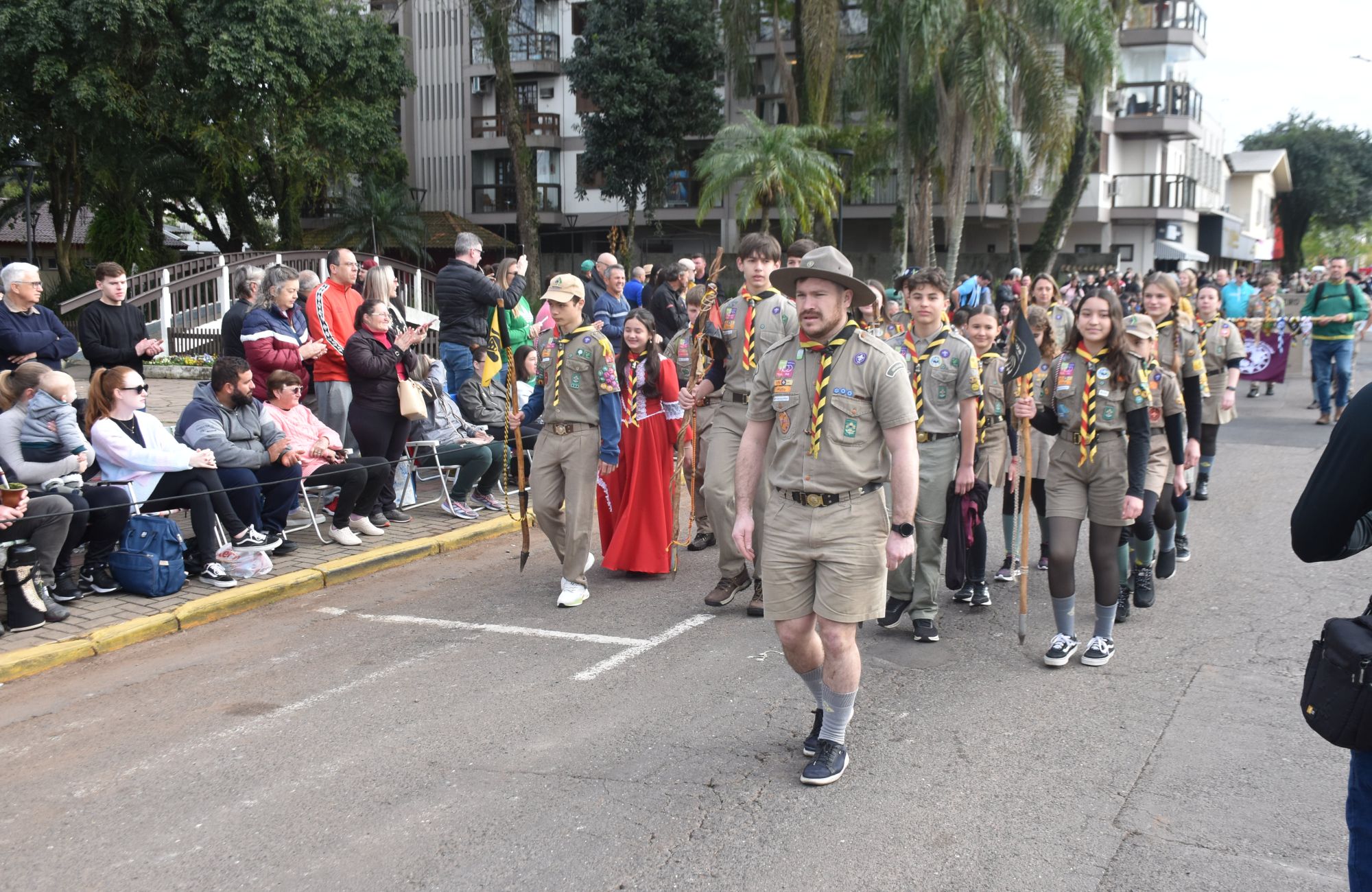 Dois Irmãos celebrou a Independência do Brasil no domingo (7) com o tradicional Desfile Cívico, realizado na Avenida 25 de Julho. Com o tema “Tradição para Inspirar e Inovação para Continuar”, o evento foi promovido pela administração municipal, por meio da Secretaria de Educação, e reuniu escolas, entidades, grupos culturais e comunitários. O desfile iniciou em frente à Biblioteca Pública e seguiu até a Rua São José, tendo o palanque oficial localizado na Praça do Imigrante. A abertura contou com escoteiros, representantes das forças de segurança, soberanas do município e bandinhas.