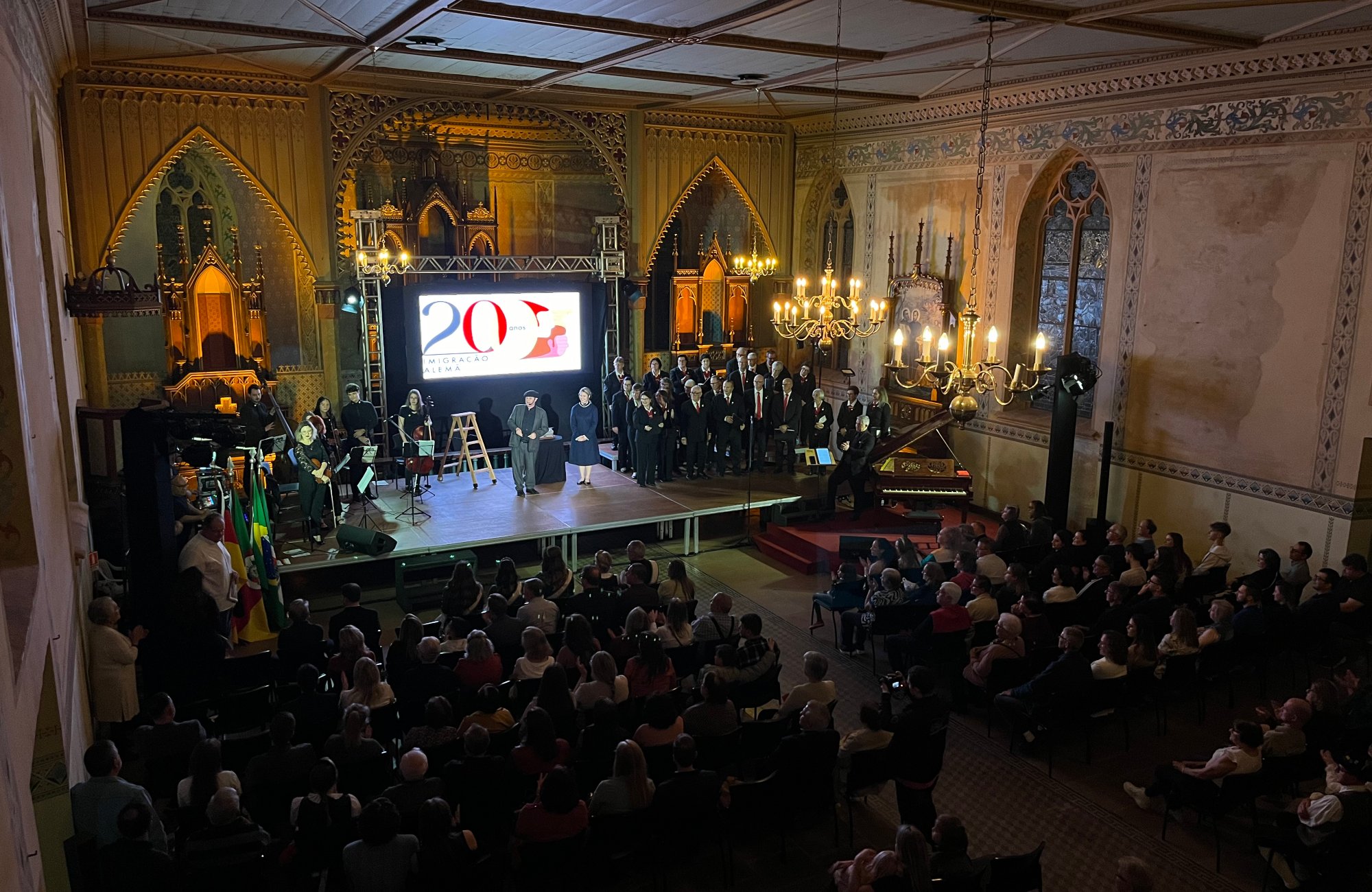 O encerramento da Semana do Bicentenário da Imigração Alemã em Dois Irmãos foi marcado pela apresentação do espetáculo teatral “Memórias em Retalhos” na quinta-feira (25). Encenada pela Companhia de Teatro Curto Arte, a peça envolveu o público ao recontar momentos fundamentais da história local, desde a chegada dos imigrantes germânicos até eventos contemporâneos que moldaram a cidade.