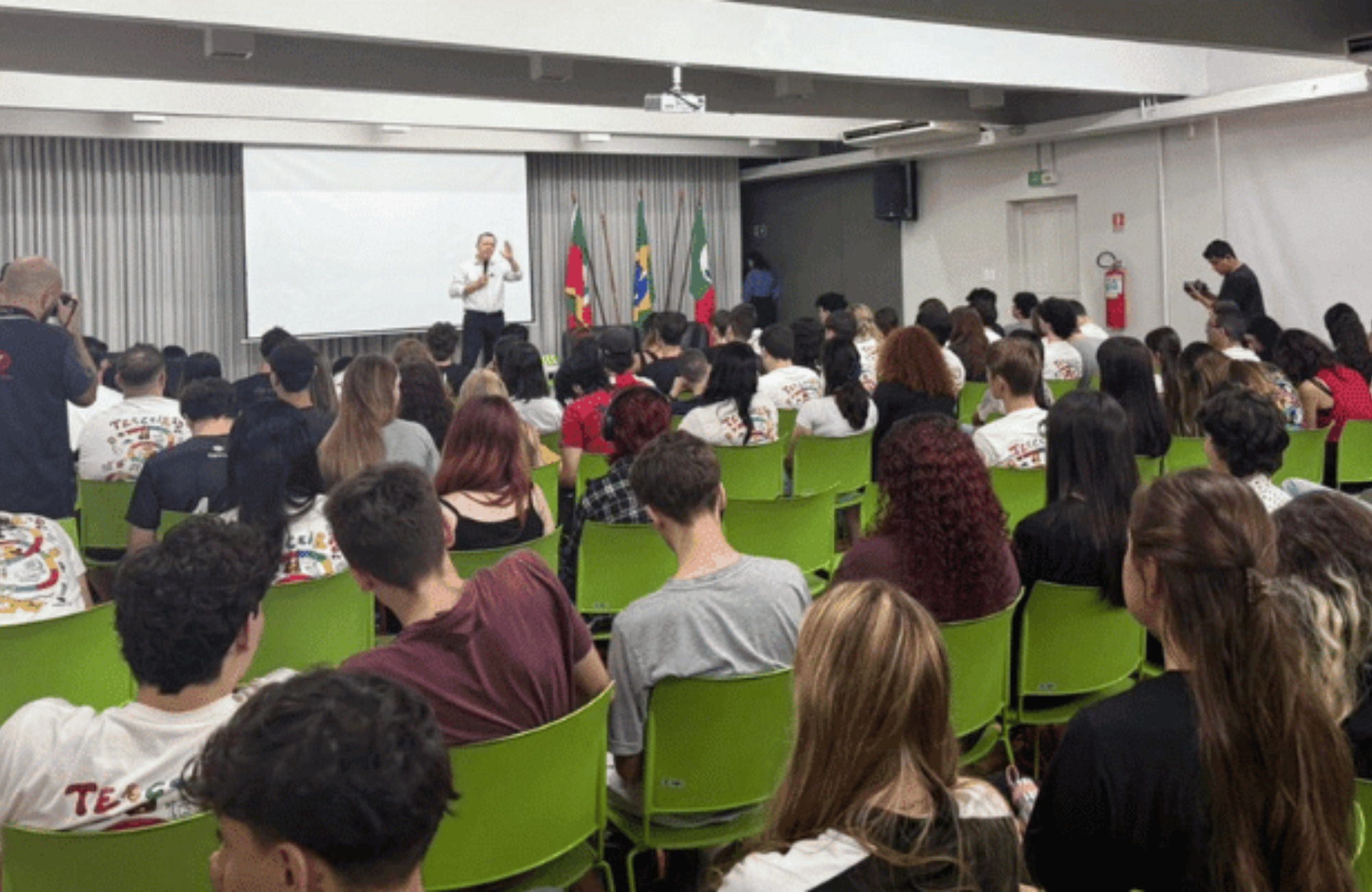 O reitor da Universidade Feevale, José Paulo da Rosa, acompanhou a programação ao lado da diretora da Escola de Aplicação Feevale, Janaína Regra, além de professores e coordenadores. O líder da instituição conversou com os estudantes e ressaltou o significado do encerramento do Ensino Médio, destacando a importância de planejar a continuidade dos estudos.