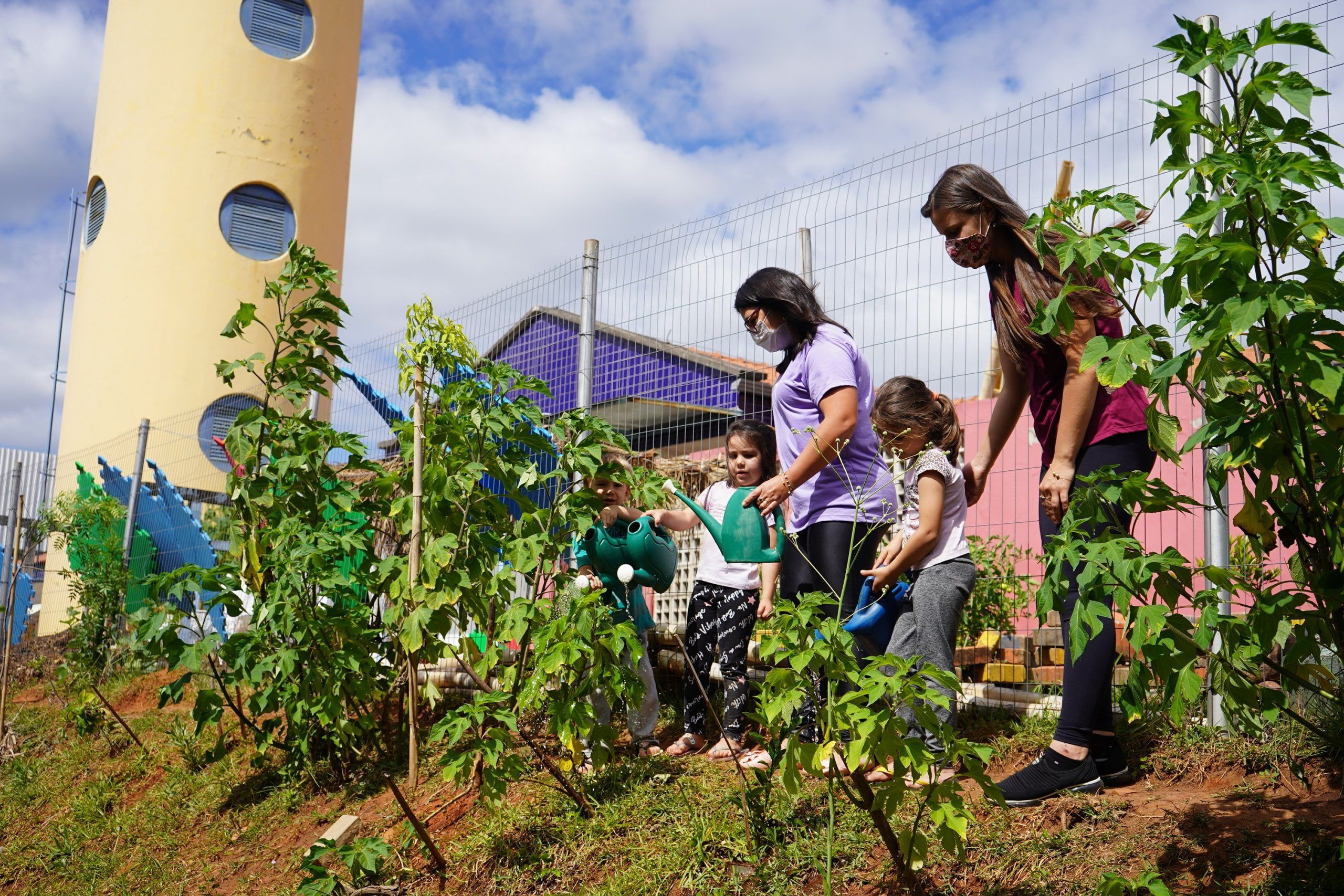 O “Bem-viver: um quintal que acolhe a infância” vem sendo desenvolvido por muitas mãos. Muito mais que uma revitalização nos espaços externos da escola, o objetivo é olhar verdadeiramente para as crianças e para suas brincadeiras no pátio. Em parceria com o Centro Municipal de Educação Ambiental Nestor Weiler (Cemea), o resgate da infância dos funcionários da escola foi o caminho para sensibilização da proposta. A partir daí, realizou-se o mapeamento da escola e, em meados de novembro de 2020, foi iniciada a revitalização dos espaços externos com plantio de margaridões, chás, temperos e canteiros sensoriais.