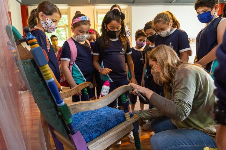 Na Villa Mimosa, os estudantes visitaram a exposição Visões da Memória, que reúne 21 trabalhos da artista Sonia Rombaldi e conta com a curadoria de Rosângela Cardoso. Para Vinicius, 9 anos, foi muito bom poder conhecer e conversar com a artista. “A parte que eu mais gostei foi quando ela falou sobre a família dela e as lembranças, foi bem emocionante”, contou o menino.