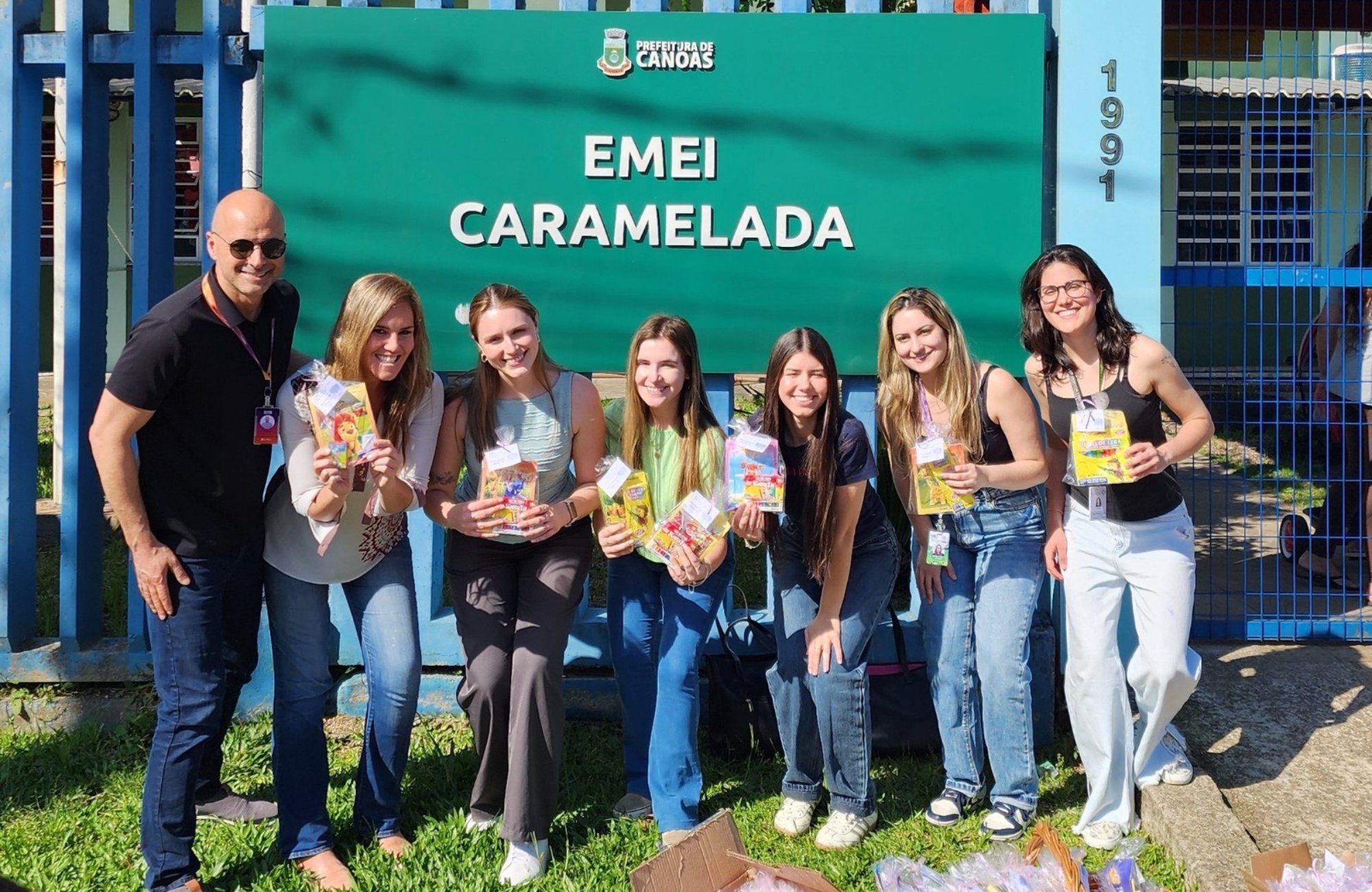 Em uma atividade voltada à solidariedade e ao Dia das Crianças, alunas da Liga de Pediatria e Neonatologia do curso de Medicina da Universidade Luterana do Brasil (Ulbra) promoveram uma ação especial na Escola Municipal de Educação Infantil (EMEI) Caramelada, em Canoas, na quinta-feira (9). Em parceria com a Pastoral da Ulbra, as futuras médicas distribuíram materiais de desenho e compartilharam momentos de alegria e afeto com os alunos da instituição.