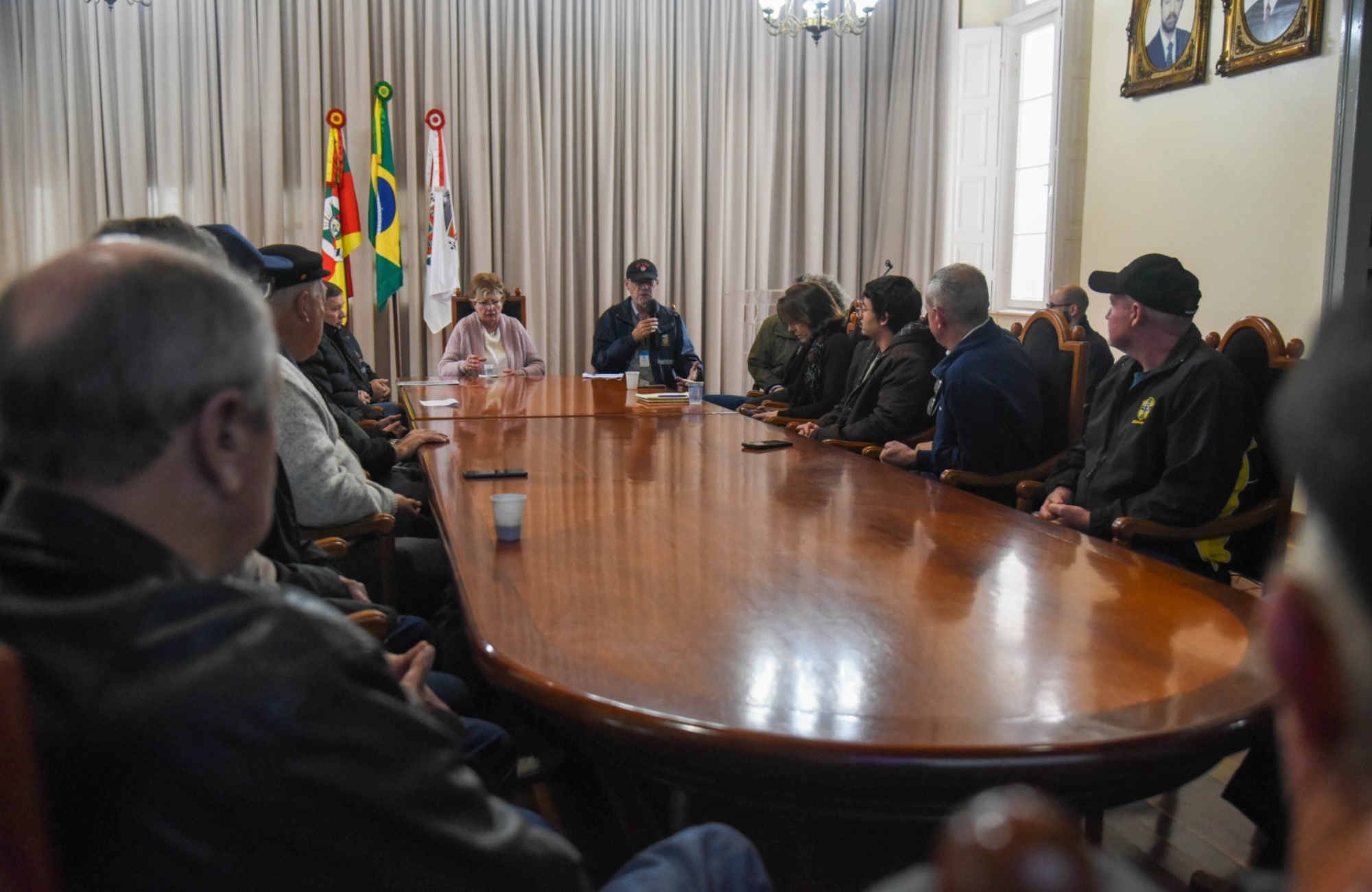 Os secretários Edmar Hermany (Obras e Infraestrutura – Seoi), Simone Schneider (Meio Ambiente, Saneamento e Sustentabilidade – Semass), Décio Hochscheidt (Agricultura – Seagri), José Joaquim Dias Barbosa (Segurança e Mobilidade Urbana – Sesmob) e Karianne Pacheco (Planejamento e Governança – Seplag), juntamente com representantes da Defesa Civil, geólogos e engenheiros da Administração Municipal.