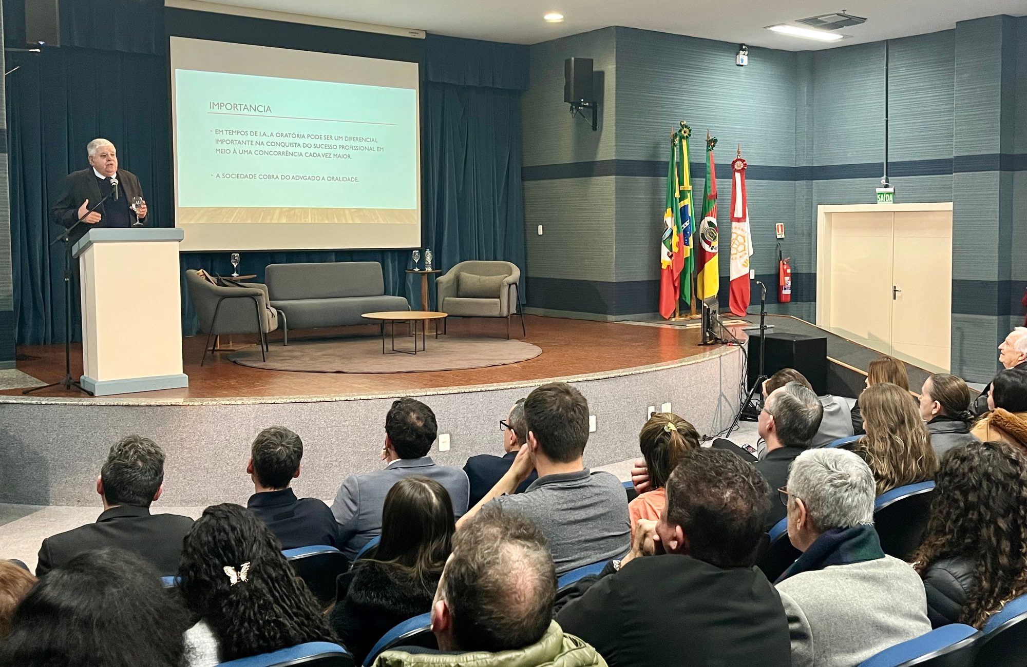 Entre as orientações práticas, o palestrante destacou a necessidade de se preparar para imprevistos, “falar de improviso sem improvisar”, controlar o tempo da fala — lembrando que a atenção da plateia tende a se dispersar após 12 minutos — e evitar vícios de linguagem, como o uso de expressões repetitivas.
