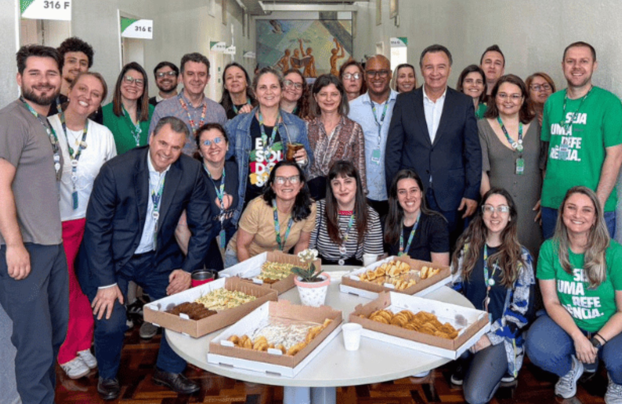 Professores da Escola de Aplicação Feevale foram homenageados nesta quarta-feira (15), em celebração ao Dia do Professor. O reitor da Universidade Feevale, José Paulo da Rosa, participou das confraternizações realizadas durante a manhã e à tarde, que reuniram docentes para um café e momentos de integração. Também estiveram presentes o pró-reitor de Pesquisa, Pós-Graduação e Extensão, Fernando Spilki, a pró-reitora de Ensino, Maria Cristina Bohnemberger, e o superintendente Executivo da Instituição, Roberto Berte.