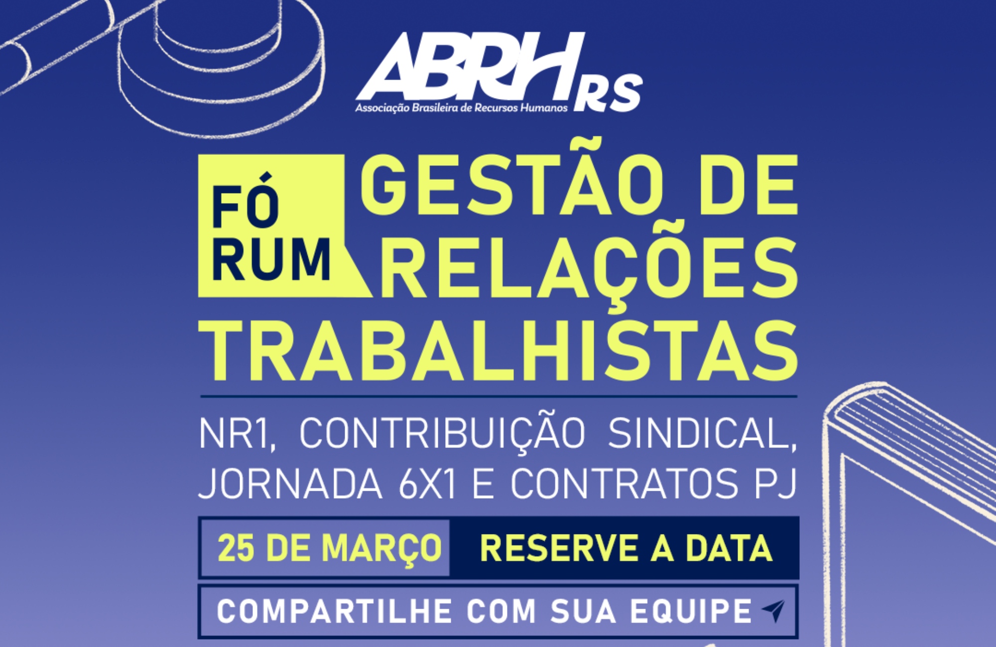 A Associação Brasileira de Recursos Humanos, seccional Rio Grande do Sul (ABRH-RS) promove o Fórum Gestão de Relações Trabalhistas no dia 25 de março e as inscrições já estão abertas. Nesta edição, que acontecerá no Nau Live Spaces – Av. Presidente Franklin Roosevelt, 1308 -, em Porto Alegre, das 12h30 às 17h30, serão abordados temas como a implementação da NR-1 e do Programa de Gerenciamento de Riscos, as contribuições sindicais, o regime 6×1 e as repercussões dos contratos PJ na esfera cível. Inscrições e mais informações pelo site abrhrs.org.br.