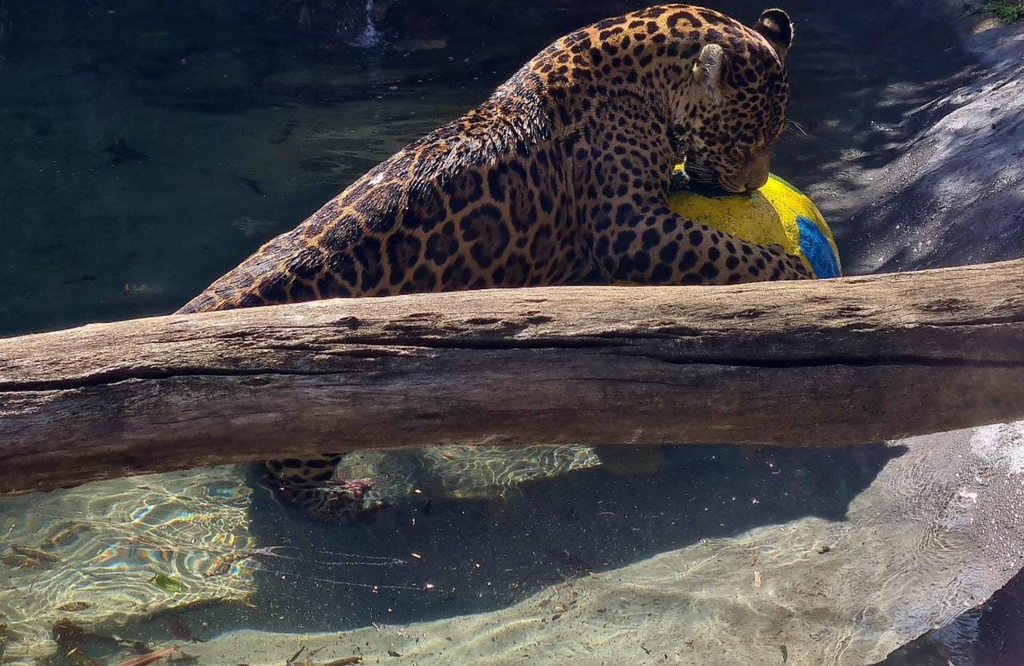 O Gramadozoo adota uma série de cuidados especiais com os animais na estação mais quente do ano. Além de petiscos congelados, o programa de enriquecimentos ambientais propõe atividades que estimulem os animais com habilidades aquáticas a entrarem na água para garantir o refresco nas altas temperaturas. Para as onças, a equipe técnica colocou uma bola com iscas de carne no lago do recinto. “Nada melhor no verão do que proporcionar enriquecimentos que estimulem os animais a se refrescarem. Com as onças, utilizamos a bola. Nós colocamos carne em alguns compartimentos que existem nela e jogamos a bola no lago. O objetivo é que os animais entrem na água e interajam com a atividade”, explica a bióloga Tathiana Gosaric, responsável técnica do Gramadozoo.
