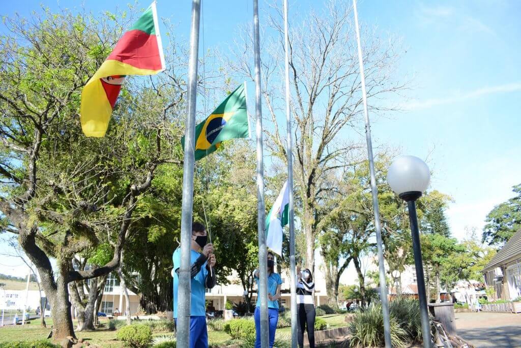 Alunos da Escola Otávio Rocha e a secretária de Saúde, Cláudia Pires, foram os escolhidos para fazer o hasteamento das bandeiras neste primeiro dia de atividades. A secretária foi escolhida como forma de homenagear os profissionais da Saúde, que estão há mais de um ano na linha de frente do enfrentamento à Covid-19.