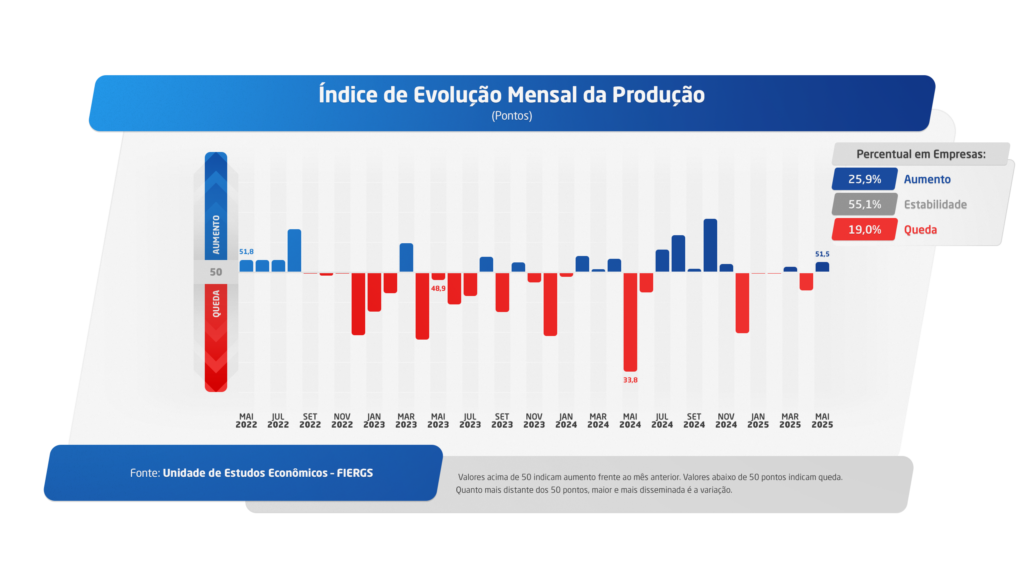 A produção industrial do Rio Grande do Sul registrou crescimento em maio de 2025, com índice de 51,5 pontos na Sondagem Industrial divulgada nesta quarta-feira (25) pelo Sistema Fiergs. O número, acima da marca de 50 pontos, indica expansão na comparação com abril e supera a média histórica para o mês, de 47,3 pontos. Apesar do avanço, o acúmulo de estoques acima do planejado acendeu um alerta no setor.