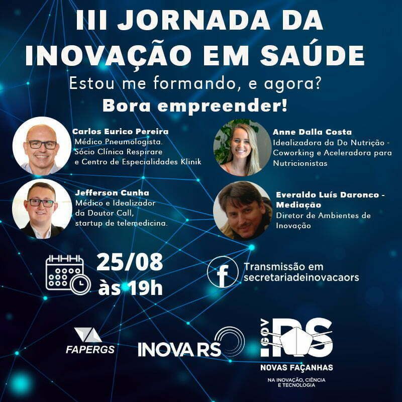As regiões do Inova RS, intituladas Metropolitana e Litoral Norte, Sul, Produção e Norte e Vales, promovem a III Jornada da Inovação em Saúde, apresentando uma conversa com a temática “Estou me formando, bora empreender?”. O evento acontece no dia 25 de agosto, às 19 horas, em formato digital.