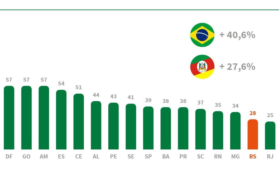 Os dados estão em um levantamento elaborado pela Federação das Indústrias do Rio Grande do Sul, por meio da Unidade de Estudos Econômicos, com base em informações do Ministério da Economia e do Instituto Brasileiro de Geografia e Estatística (IBGE). Segundo a entidade, os resultados ajudam a refutar o argumento de que o Piso Regional traz crescimento e dinamismo para a economia. A FIERGS destaca, ainda, que Paraná, Rio de Janeiro, Santa Catarina e São Paulo também adotam o Mínimo Regional, e figuram entre os estados que apresentaram as menores expansões de PIB na mesma base de comparação.