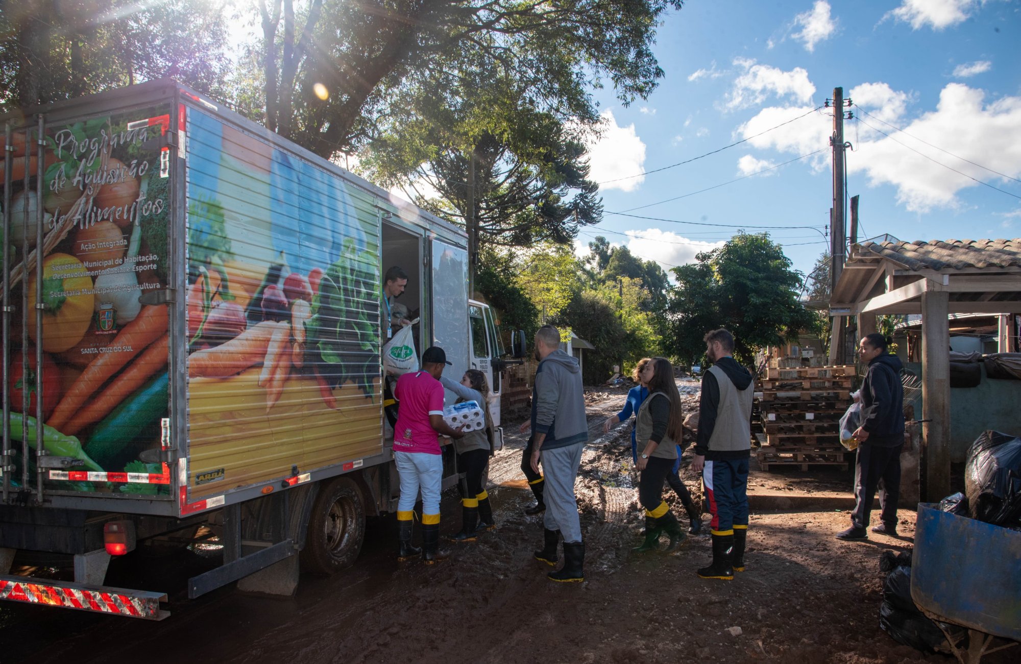 Um caminhão cheio de mantimentos, contendo alimentos não perecíveis, lanches, água e produtos de higiene e limpeza, foi transportado do Pavilhão Central do Parque da Oktoberfest até residências do Bairro Várzea na tarde desta segunda-feira, 20, em uma ação destinada a abastecer mais de 100 famílias. A atenção foi direcionada de forma especial à região de Navegantes, uma das mais duramente atingidas pela enchente em Santa Cruz do Sul.