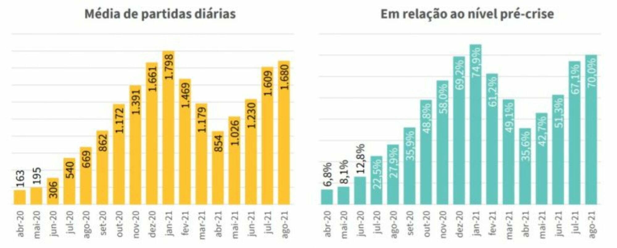 As companhias aéreas nacionais registram, em agosto, o quarto mês consecutivo de crescimento no número de voos domésticos, com uma média de partidas diárias de 1.680, ou o equivalente a 70% da oferta de voos no início de março de 2020, antes dos severos impactos da pandemia da Covid-19 no setor. É o segundo melhor desempenho desse indicador desde o início da pandemia, ficando atrás apenas dos 75% de janeiro de 2021. O levantamento é da Associação Brasileira das Empresas Aéreas (ABEAR), com dados da Agência Nacional de Aviação Civil (ANAC).