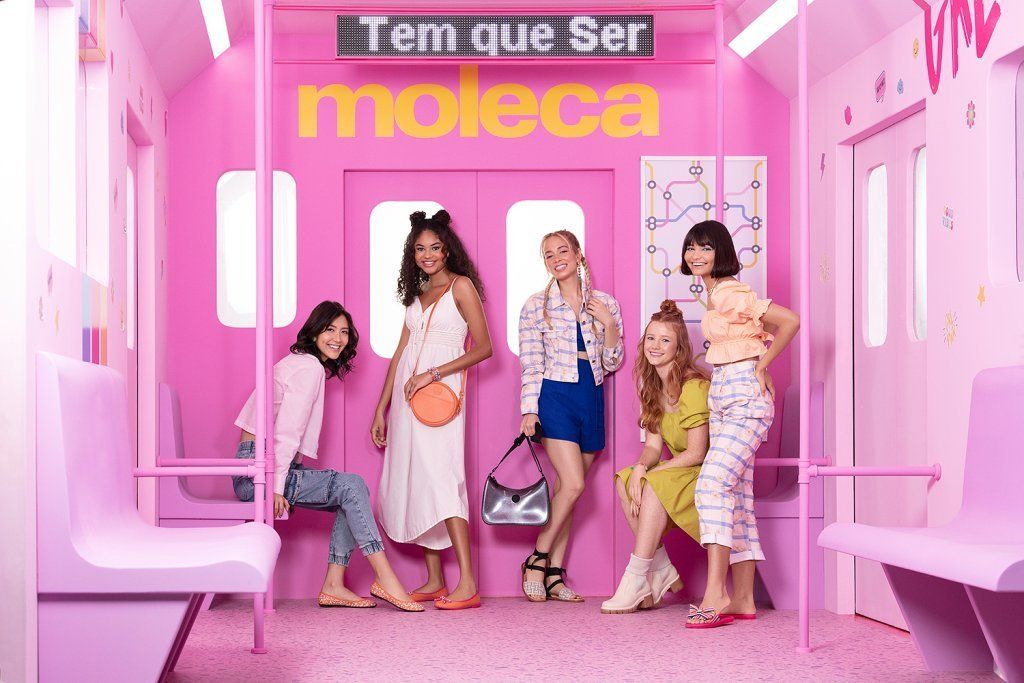 Na assinatura visual das fotos da nova campanha, a Moleca sugere uma ambientação no metrô de forma estilizada, já que o espaço é palco da vida real e detém uma das maiores concentrações de modelos Moleca, desfilando nos pés das mulheres, por metro quadrado do país! Além disso, a escolha desse background tem significados afetivos como ritmo, diversidade e senso coletivo. E magicamente também se transforma em uma balada, ou ainda, em um cenário digno de ser fotografado e postado nos feeds das redes sociais das milhares de fãs da marca. Afinal, pode ser o que a consumidora quiser, já que os locais estão cada vez mais fluidos e versáteis, na companhia de um ar festivo que invadiu as ruas novamente.