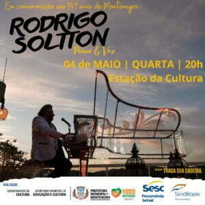 No dia 4 de maio o Serviço Social do Comércio (Sesc) dará um presente para a comunidade: o show piano e voz com o músico Rodrigo Sollton. Será uma realização do Sesc Montenegro em parceria com o Sindilojas e prefeitura. Segundo Mara, neste dia também haverá contrapartida a Lei Aldir Blanc. A empresa Marca Produções, que também foi beneficiada pela lei, montará o palco, o som e a iluminação deste show, que também não terá custo para a administração. O show será às 20h na Estação da Cultura.