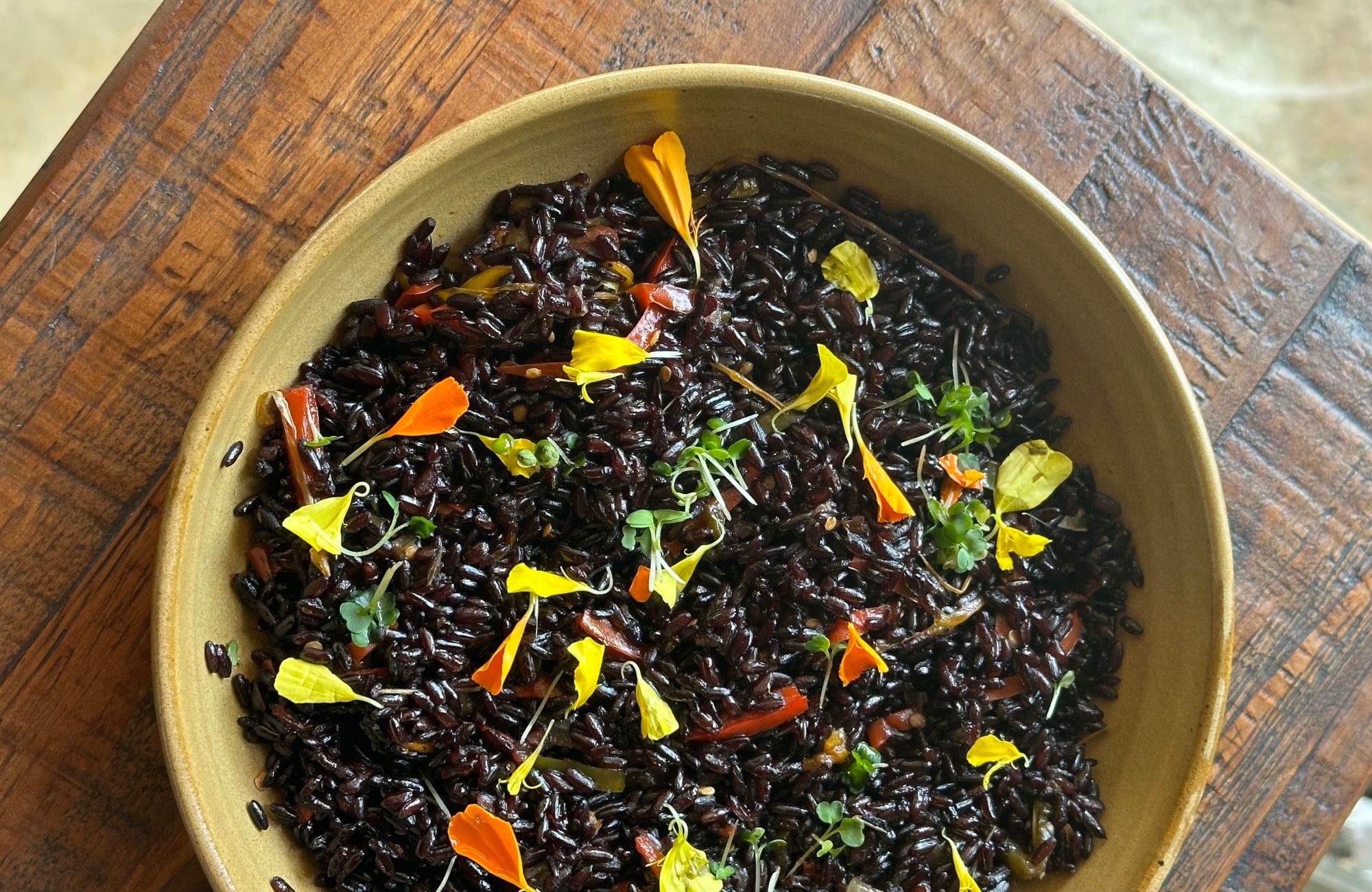 Arroz Nègre Vegà – arroz negro com cogumelos, acompanhado de escalivada (pimetão, beringela e cebola confitada).