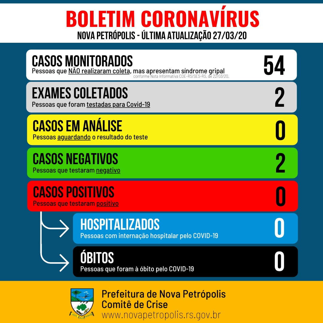A partir desta quinta-feira, 26, a Secretaria de Saúde e Assistência Social de Nova Petrópolis passou a informar também os casos monitorados no município, ou seja, pessoas que não realizaram coleta, mas, são acompanhadas porque apresentam síndrome gripal, conforme determinação da Nota Informativa COE-RS/SES-RS, de 22/03/20. Nesta sexta-feira, 27, há 54 casos monitorados.