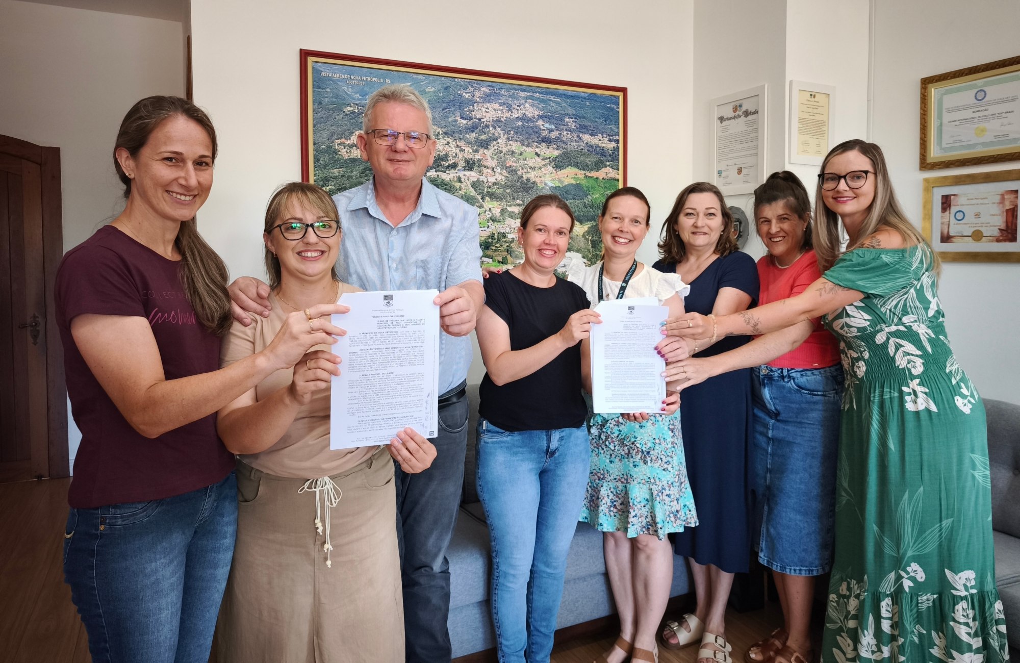 A Prefeitura de Nova Petrópolis firmou, na manhã desta quinta-feira (15), um Termo de Parceria com a Associação Turismo e Meio Ambiente (Aturma) para o repasse de R$ 8.345.022,00 destinados ao fortalecimento do suporte pedagógico da educação infantil na modalidade creche. O acordo foi assinado no gabinete oficial pelo prefeito Daniel Carlos Michaelsen (Republicanos) e pela presidente da Aturma, Veridiana Sebastiani. O objetivo é garantir recursos para a manutenção e qualificação do atendimento nas Escolas Municipais de Educação Infantil (EMEIs).