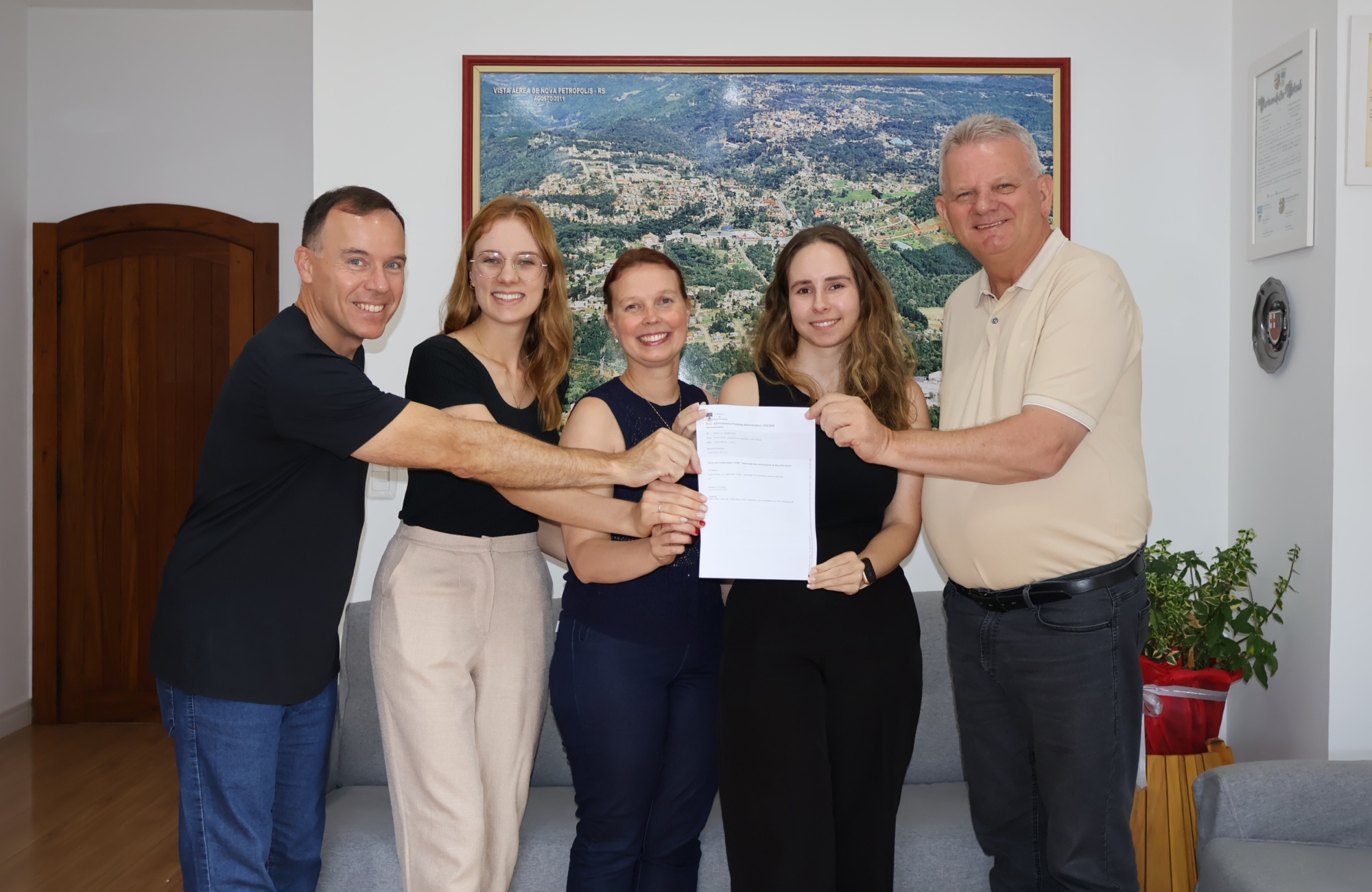 A Prefeitura de Nova Petrópolis assinou o termo de colaboração com a Associação dos Universitários de Nova Petrópolis (AUNP) na manhã desta sexta-feira (20), no Gabinete Oficial, para o repasse de até R$ 570 mil destinados ao custeio do transporte de estudantes universitários no período de março a dezembro de 2026.