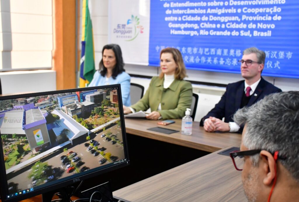 A prefeita de Novo Hamburgo, Fátima Daudt, e o prefeito do Governo Popular Municipal de Dongguan, no sudeste da China, Lyu Chengxi, assinaram na manhã de hoje, 15 de junho, documento oficial de entendimento sobre desenvolvimento conjunto de relação amigável para cooperação e intercâmbio. A cidade chinesa conta com grande presença de brasileiros, especialmente de Novo Hamburgo. O ato foi realizado em encontro virtual. O documento foi assinado por Fátima e pelo prefeito do Governo Popular Municipal de Dongguan, Lyu Chengxi.