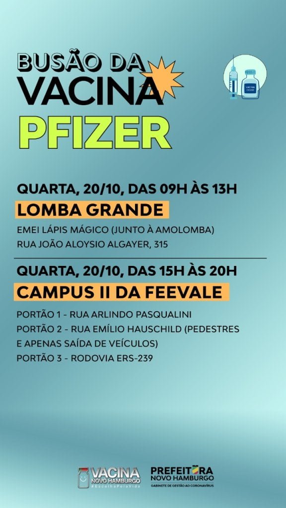 A Unidade Móvel de Vacinação, o Busão da Vacina, estará nesta quarta-feira, 20 de outubro, das 9h às 13h, em Lomba Grande, na Emei Lápis Mágico (Junto à Amolomba – Rua João Aloysio Algayer, 315). Já das 15h às 20h, a vacinação ocorrerá no Salão de Atos do Prédio Lilás, no campus II da Feevale, com acesso pelo Portão 1 (Rua Arlindo Pasqualini) ou Portão 2 (Rua Emílio Hauschild – pedestres e apenas saída de veículos) ou Portão 3 (rodovia ERS-239).