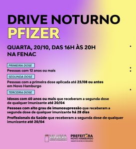 Os veículos deverão entrar na Fenac pelo acesso da Avenida Nações Unidas. Para receber a dose de reforço os profissionais da saúde devem apresentar documento de identificação, comprovante da segunda dose e comprovante que trabalham em Novo Hamburgo.