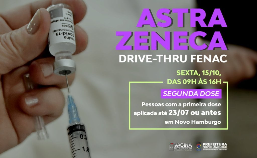 Novo Hamburgo terá mais um drive-thru nos pavilhões da Fenac de aplicação da segunda dose da Fiocruz / Astrazeneca da vacina contra a covid. Será nesta sexta-feira, dia 15, das 09h às 16h. Deverão completar o esquema vacinal as pessoas que receberam a primeira dose até o dia 23 de julho ou antes. A entrada é pelo acesso da Avenida Nações Unidas.