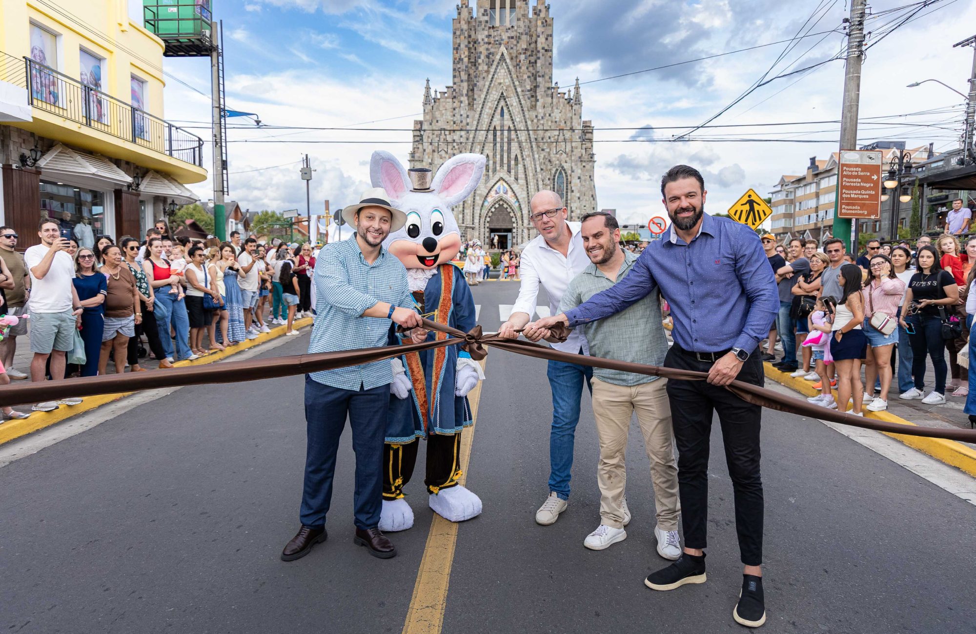 A Páscoa em Canela 2026 começou no sábado, dia 21, e, para marcar o primeiro dia da programação, uma cerimônia foi realizada na Rua Felisberto Soares, em frente a Catedral de Pedra, antecedendo a primeira apresentação do Desfile Encantado de Páscoa. Abrindo os trabalhos, o secretário de Turismo e Cultura, Athos Cunha, e o prefeito Gilberto Cezar, deram as boas-vindas ao público que prestigiou o ato. O momento contou, ainda, com a presença do deputado estadual, Joel Wilhelm, vereadores, soberanas da Festa Colonial e um grande público que aguardava ansioso o início da atração.
