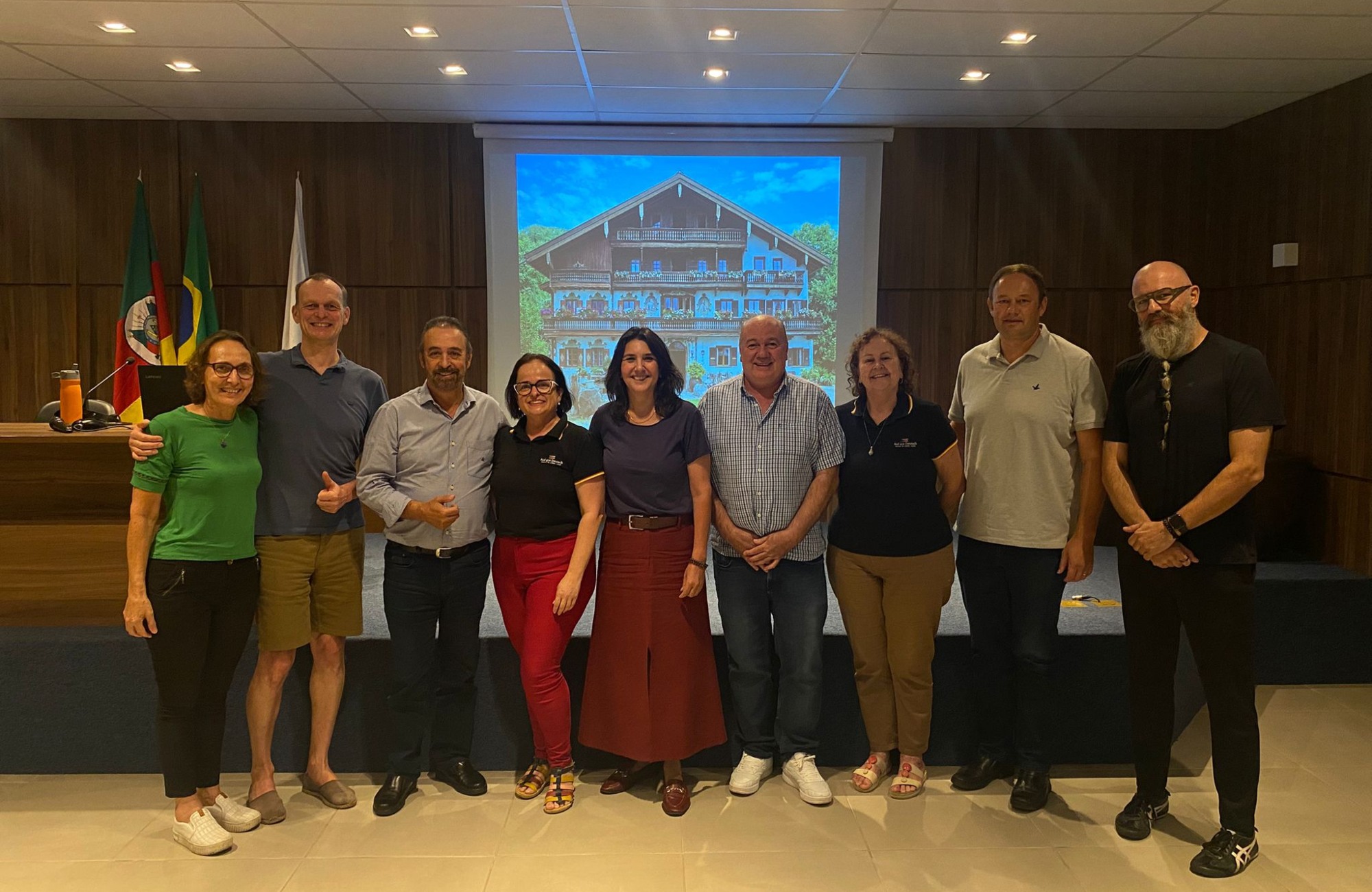 A proposta de construção de um prédio com características germânicas para abrigar o Instituto Auf gut Deutsch foi apresentada nesta terça-feira (17) ao prefeito de Santa Cruz do Sul, Sérgio Moraes (PL). O projeto foi detalhado pela professora Jaqueline Bender, proprietária da Escola de Língua Alemã Auf gut Deutsch, durante reunião no auditório da Procuradoria Geral do município, com a presença do investidor alemão Erich Klas. A iniciativa prevê a edificação de um espaço voltado à integração cultural, educacional e profissional entre Brasil e Alemanha, com possível instalação junto ao Parque da Oktoberfest.