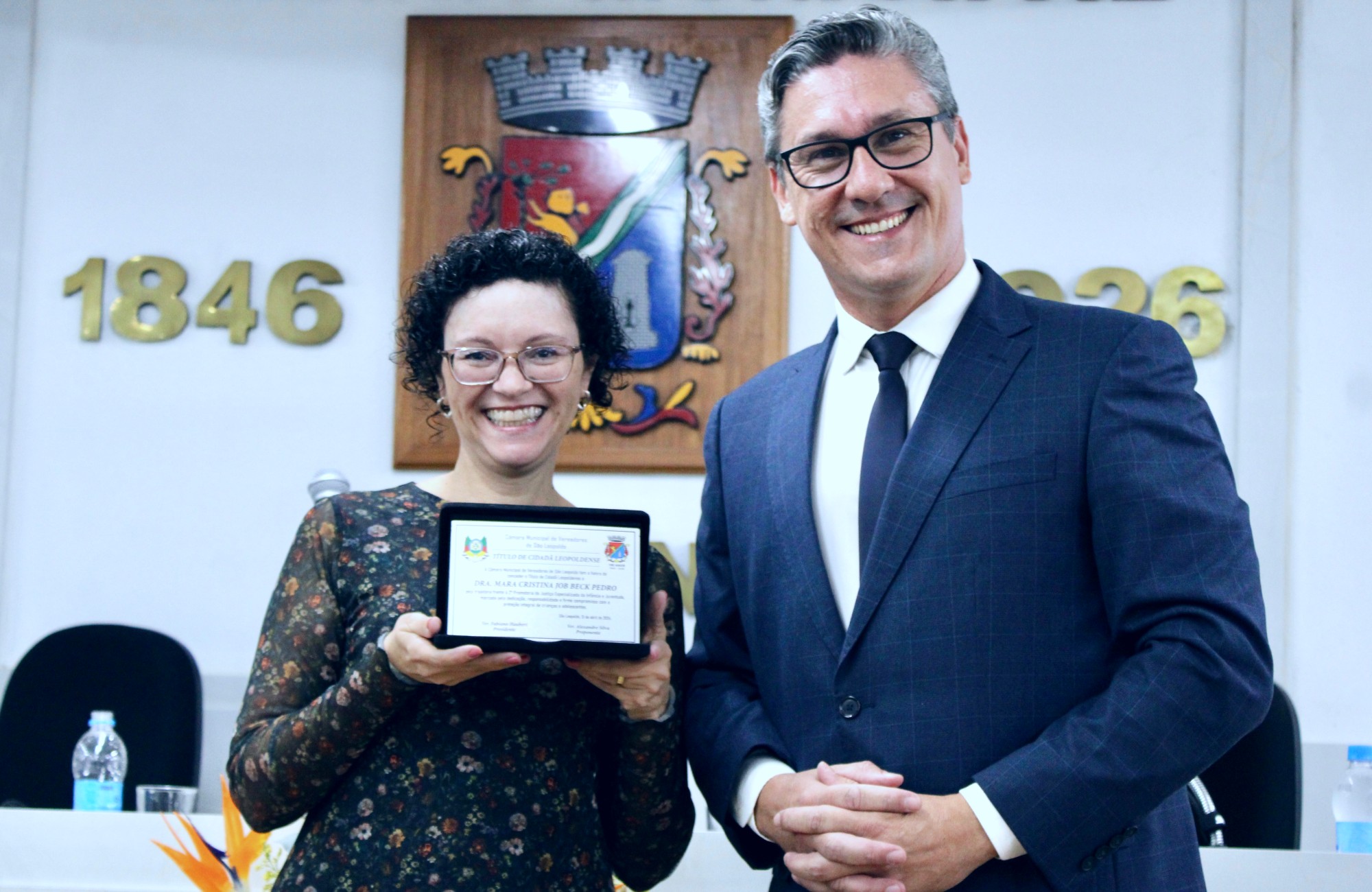 A Câmara de Vereadores de São Leopoldo concedeu o título de Cidadã Leopoldense à promotora de justiça Mara Cristiane Job Beck Pedro na noite desta segunda-feira (13). A homenagem foi realizada em sessão solene no plenário da casa legislativa e reconhece a atuação da promotora na defesa dos direitos da comunidade, com destaque para a proteção de crianças e adolescentes no município. A iniciativa foi proposta pelo vereador Alexandre Silva (PL).